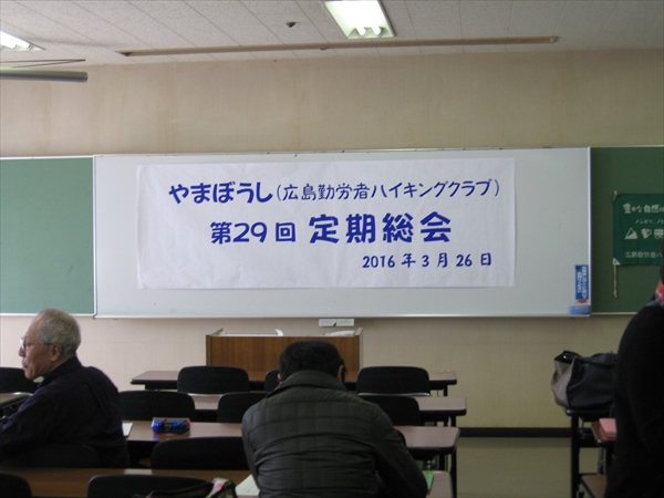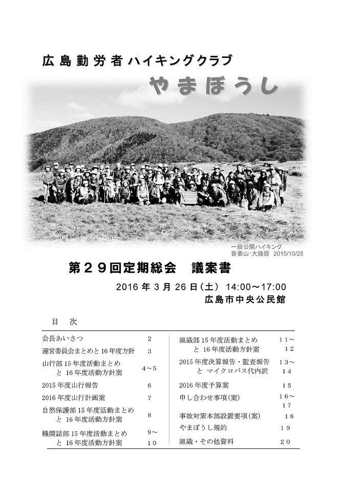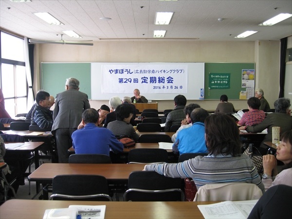 若木会長の「みんなで創るやまぼうし」を合言葉に会への思いを述べられた後、運営委員会・山行部・自然保護部・機関紙部・組織部の16年度の活動のまとめと 17年度の活動方針案が示され、出席者全員にて承認されました。