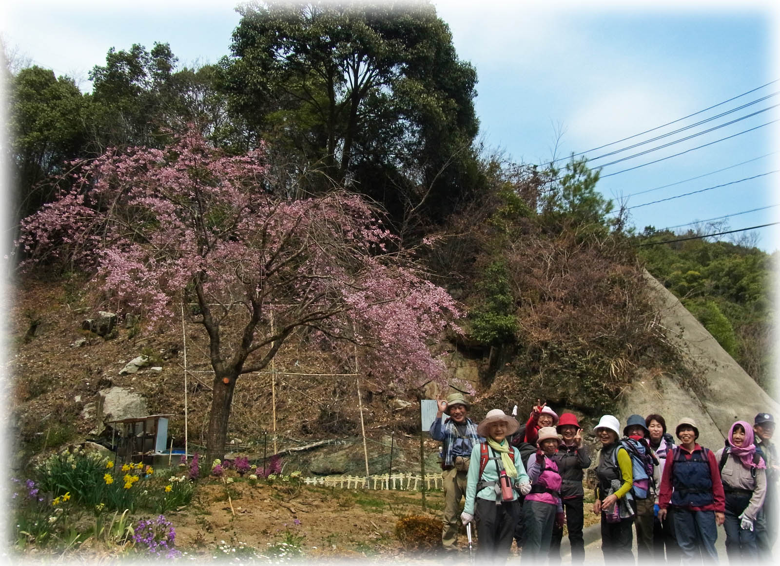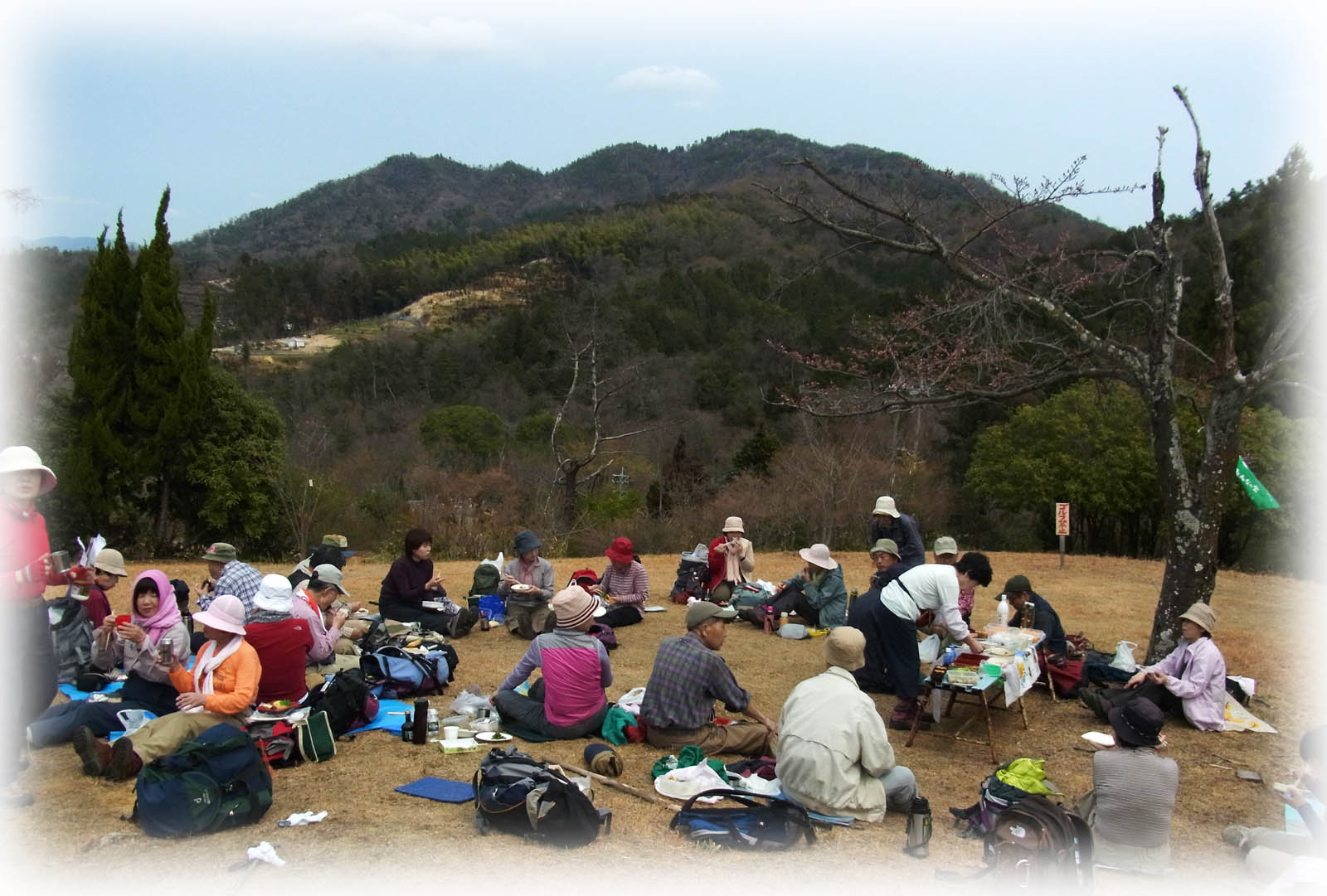天気予報どうり朝のうちは少し肌寒く、雲の多い天候だったがだんだんと気温が上がり、空もきれいに晴れ渡ってきた。参加者は28名と現地で合流する1名をあわせ29名とたくさんの参加があった。憩いの森では残念ながら桜はまだ全く咲いておらず、花といえばツバキやサザンカが少し見当たる程度。しかし穏やかなお天気のもと、用意していただいた一品料理など味わいながらお花見酒がすすみ、歌やおしゃべりで盛り上がった。解散後は高陽町方面、温品方面、そして松笠山を越えて戸坂駅方面と3グループに分かれて帰路についた。 (記 宮木一民)