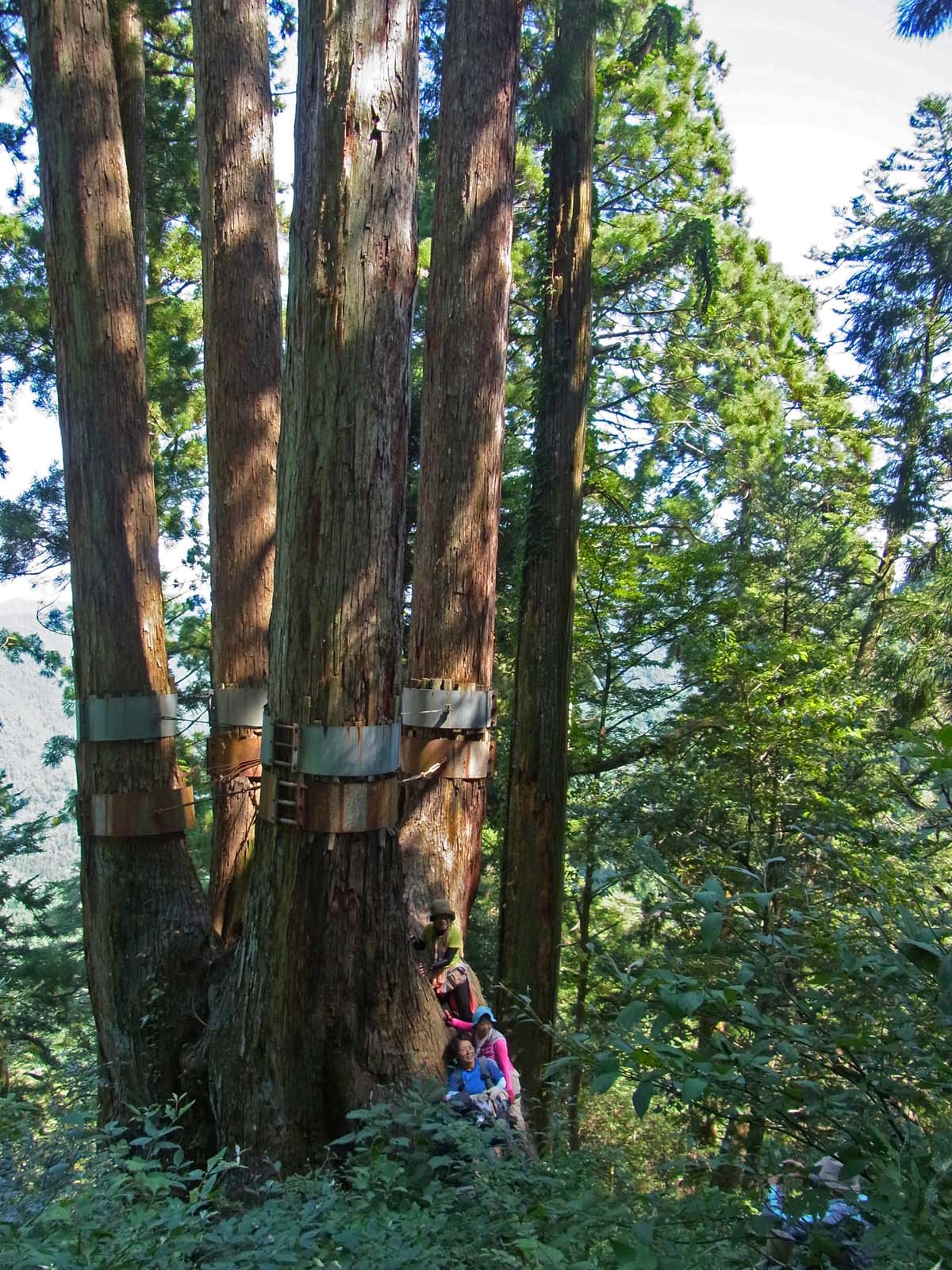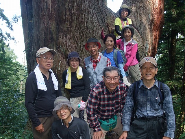 しばらく登ると山頂に到着しました。山頂で(片道40分の行程で四本杉まで行く)の希望者を募り、10分後に出発しました。最初は笹の坂道続いて樹林帯の横道と坂道を下りること40分、大きな四本杉が木々の間から少し姿を現した、やっと着いたと安堵の溜息,樹木に寄り添い記念写真、山ガールが愛情を持って樹木に寄り添うと木々も栄養を頂いたように見えるのは我のみかな。また来た道を頂上を目指して急坂を行く。上のほうで山彦がありほっとして急いで登る。やっと頂上に着いた。