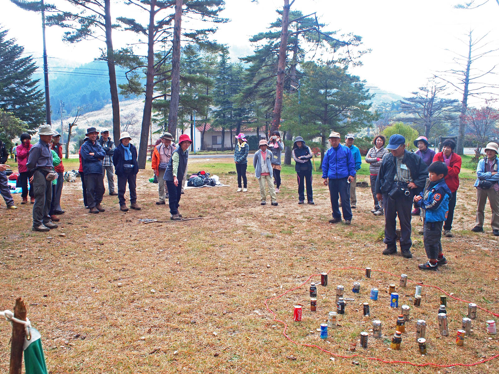 羅漢高原へ下り、適当な場所を選んで昼食とした。班毎に陣取って恒例の豚汁。美味しくて皆御代わりが欲しそうであった。皆で歌を唄い、それから班対抗でカラビナ投げに興じた。記念写真の後、バスに乗り、羅漢高原を後にした。