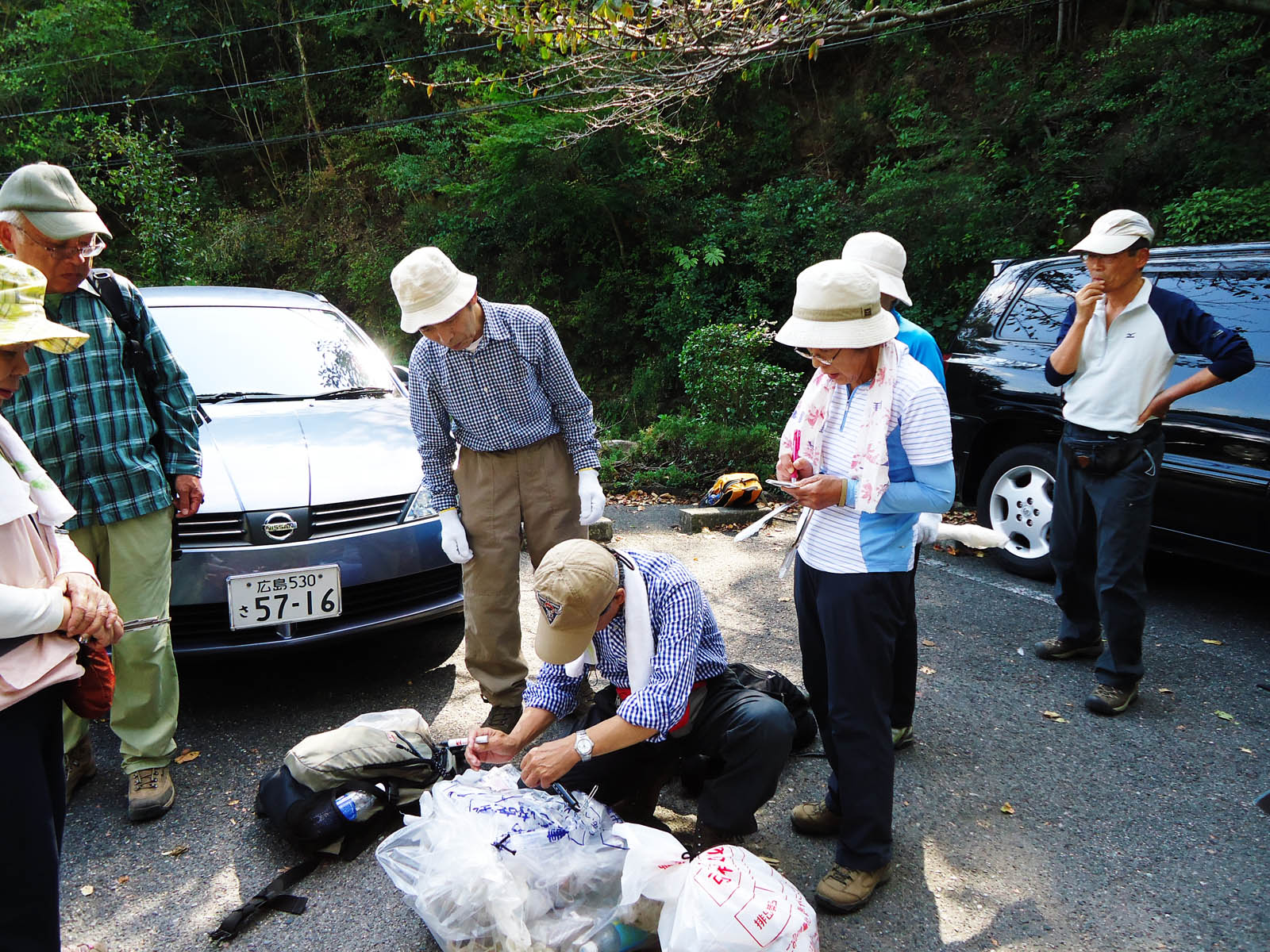 駐車場で、ストレッチ、自己紹介、軍手とビニール袋を配り、Bコースより開始する。キョロキョロと目を凝らし、ゴミなる物を探しゆっくりと登る。