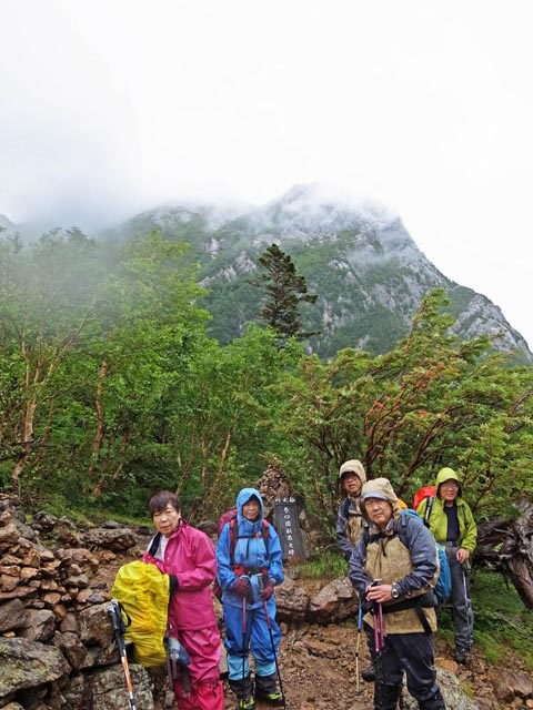 7月29日(月) 芦安白雲荘からタクシーで広河原へそこからバスで北沢峠、7:30登山口出発。広河原から雨。合羽を着てゆっくり登る。2502ピーク、双児山は計画より20分〜30分おくれ。6合目駒津峰は11時着。雨、風、ガスでここから頂上へ行くかどうか判断をせまられた。頂上まで往復4時間かかるし、ガスで視界はゼロ。仙水小屋の予約到着時間には難しい等の判断で下山することにした。駒津峰で1分〜2分くらいの間で風が強く一気に体温が下がる体験をし、トムラウシの低体温症のことが頭をよぎった。風の恐怖をあじわった。仙水小屋へは3時30分予定より2時間早く13時30分に到着。夕食は4時。山小屋で刺身が出たのは驚きであった。ここは人数の制限、小屋へ入る時間の厳守などがあるのが食事をみてわかった。なかなか予約がとれないのだが、CLの一度泊まりたい小屋だったようで、北アルプスと違う山小屋を体験できた。