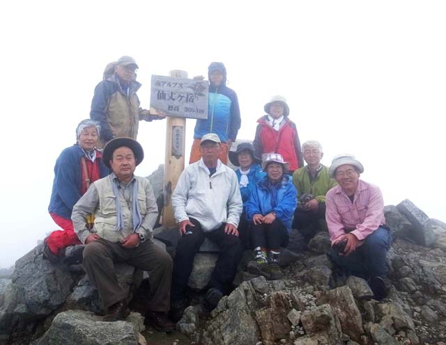 7月30日(火)仙水小屋5時出発。曇りのなかほぼ計画通りに仙丈ヶ岳山頂に立つことができた。ガスのため眺望は望めなかったが、山頂で県北山の会の豊原さんパーテイにあって感激。下山は馬の背ヒュッテから藪沢コースを下りる。途中、雪による登山道中止の看板があったが、もう雪はないだろうという判断で続行。しかし、雪渓は多く残っており、岩場などの悪道を滑らないよう緊張の連続で下山。10時間の歩行となり、下山口ではみんなヘトヘト状態。下山口の小屋の人からこのコースは以前から禁止になっていたのよと言われた。どおりで登山道に踏み跡がなかったのがわかった。結果は今日の登山で、今回の甲斐駒ヶ岳・仙丈ヶ岳の南アルプス山行は歩き切ったという満足感を味わうことができた。バスの中から美しい甲斐駒ヶ岳の姿を見ることができて2度目の満足感を味わう。今日の宿は桃の木温泉宿。24時間のいで湯宿で疲れを取るのに十分であった。