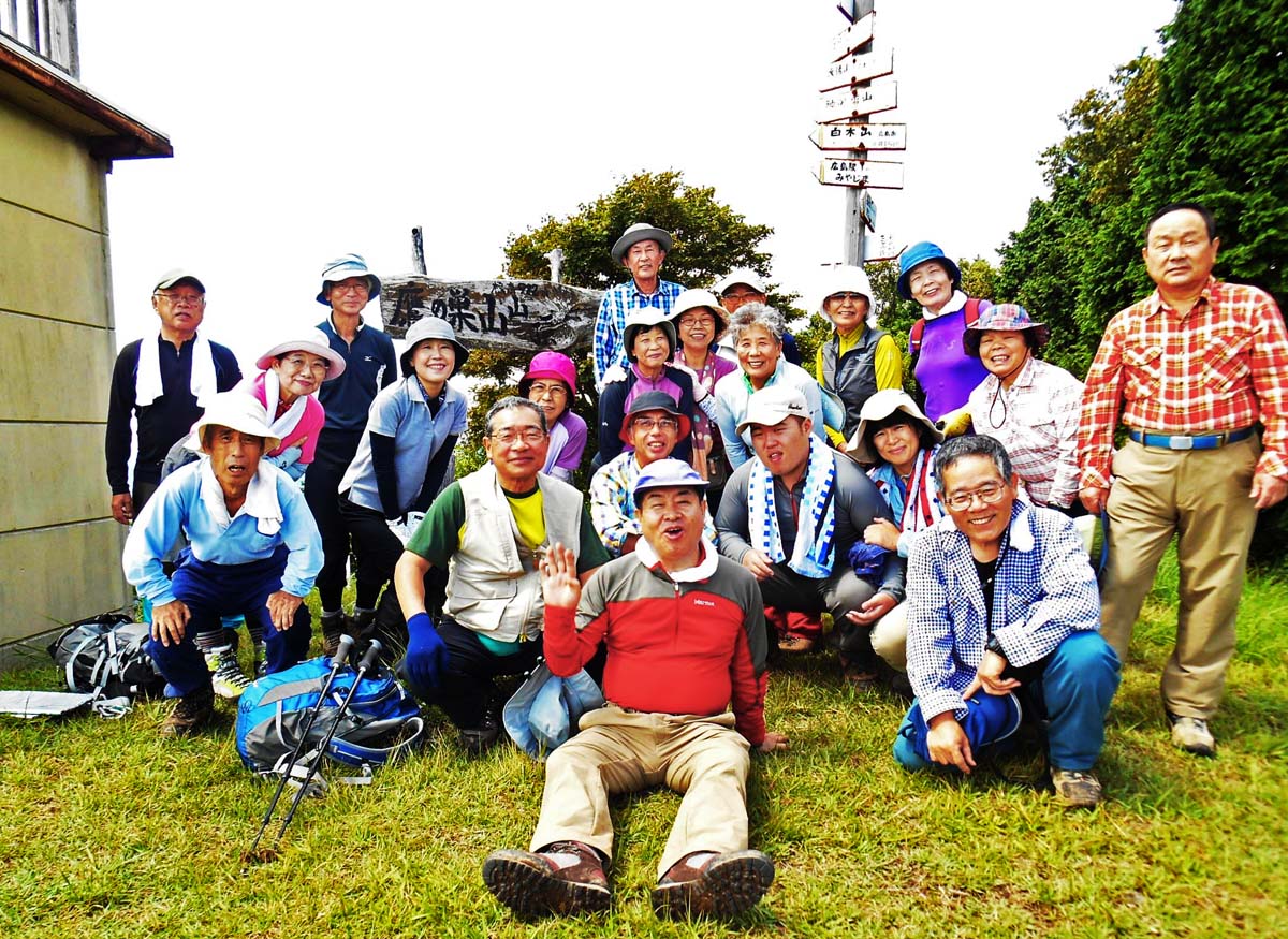 山頂では、一等三角点の標石に触れ、快晴の空の下で遠くの山々を望みながら昼食をとりました。昼食後は3班の対抗戦でカラビナ投げに興じ子供に帰ったように戯れました。