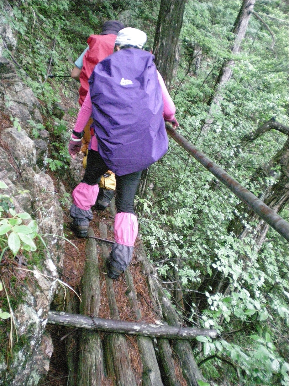 | 「かえる」がお出迎え | 緑が綺麗です | 最初の難関! | リーダーのリードで無事に渡ります |
