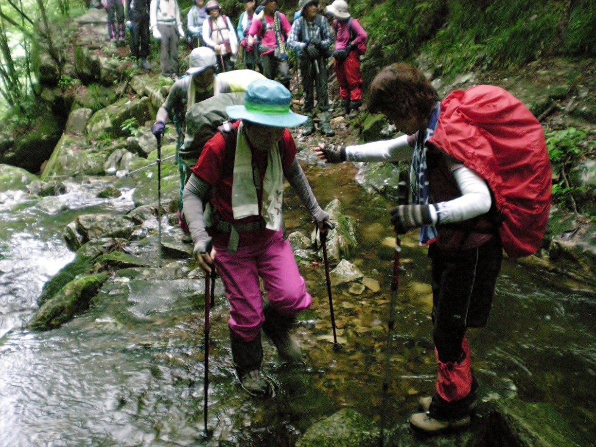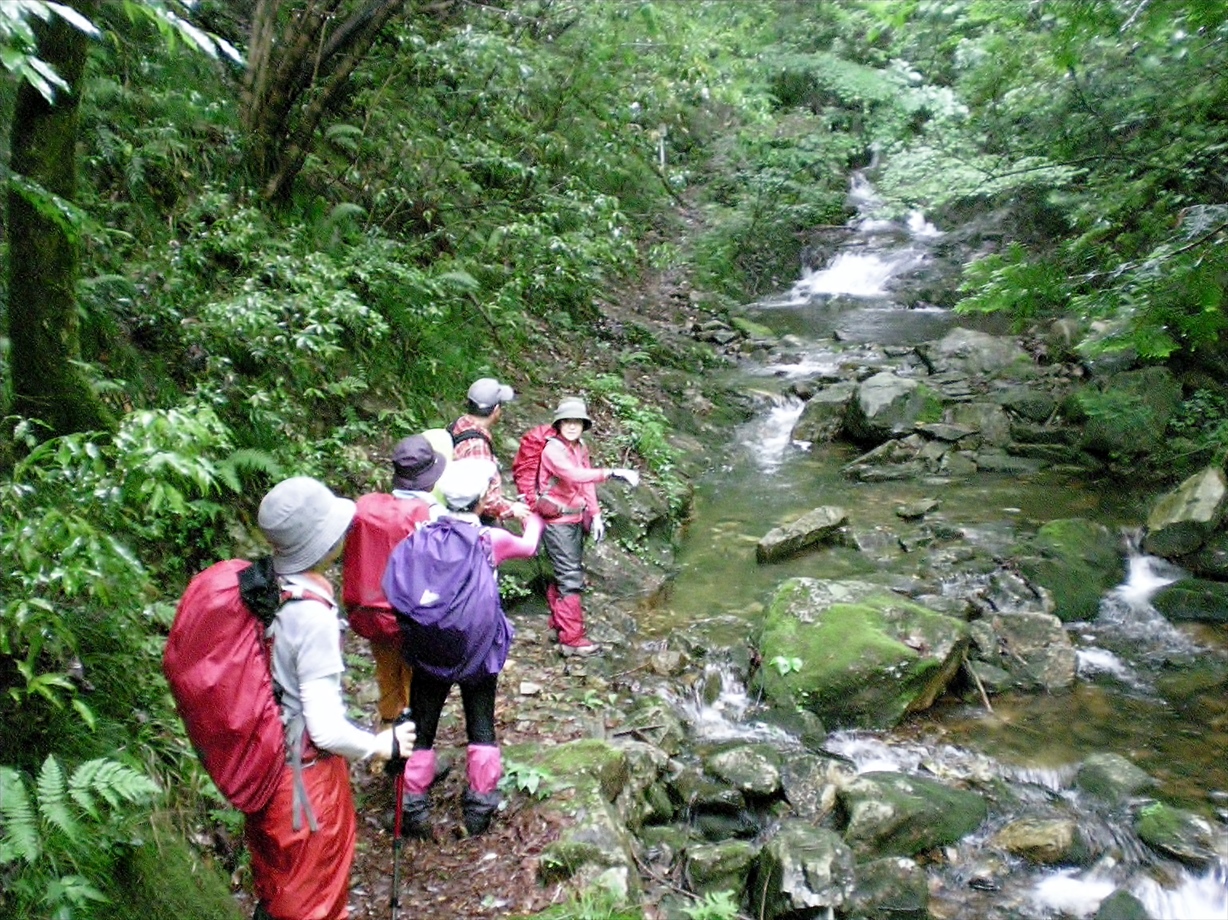 | 次は山道 | また、沢を渡ります | 足元を確かめながら・・・ | 振り返ると何やら白い塊が・・・ |