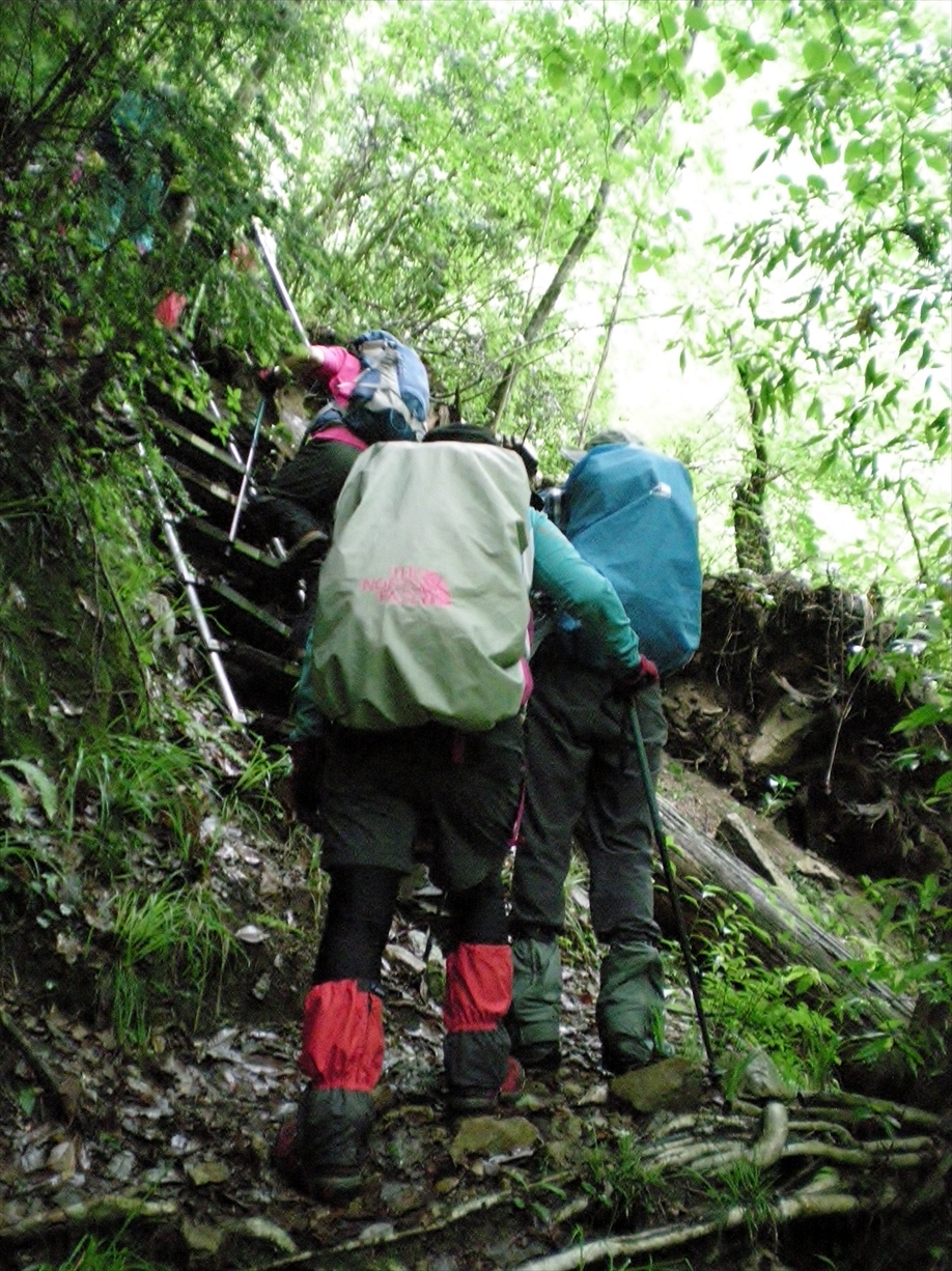 | ナメラ滝標識 | ナメラ滝 → 戻って準備体操後 → | ザック担いで登山開始 | 早速こんな階段 |