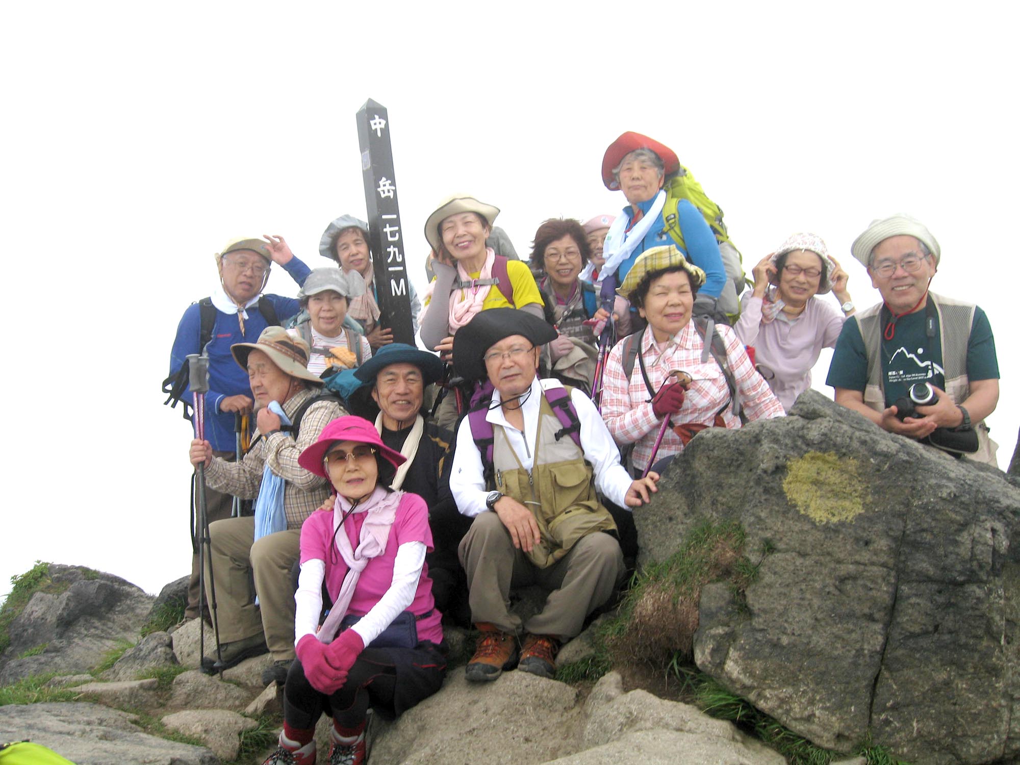 木陰のない26日の行程は暑さが心配だったが、霧に包まれ夏とは思えない涼しさの中を登った。初めは霧のため真っ白だった風景も登るにつれ時折霧が流れ、切れ間から斜面に広がるノリウツギの白い群生が姿を現す。幻想的な風景に思わず息を呑む。久住山山頂は視界が悪く、御池を巡り中岳を目指す。中岳山頂は強風で立っていられない。風を避け昼食をとっていると、何と!!視界が完全に開け、眼下に坊ガつる、目の前に大船山、振り返れば、久住山。見られないと思っていた景色を目にして感激。その後の法華院温泉を目指す長い道程もさほど暑くなく歩を進める。また、九重連山は火山を源の山容であることを感じながら法華院温泉山荘に到着。実り多い1日であった。