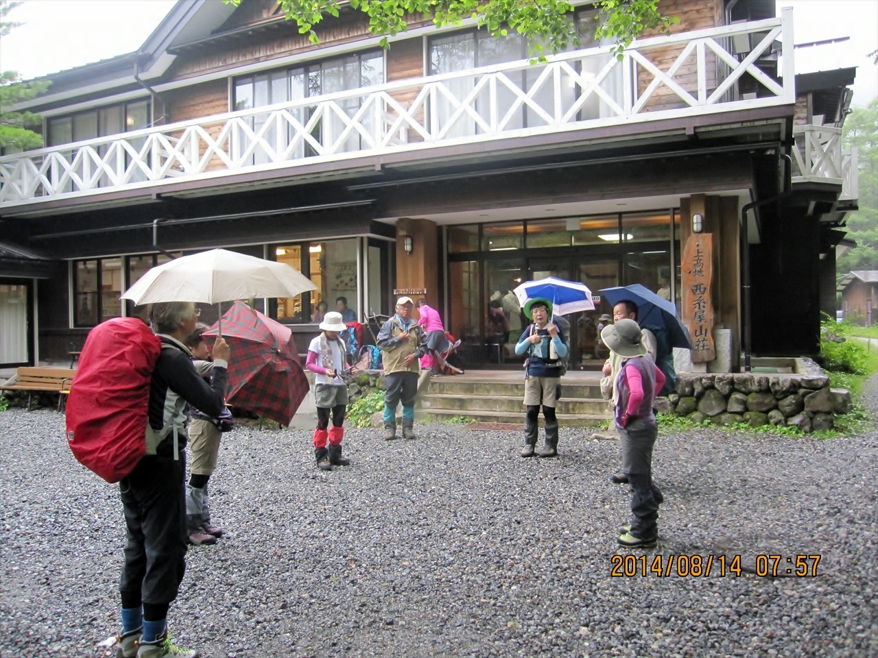 | 西糸屋山荘前にて結団式 → | 河童橋 出発 → | 梓川沿いに進む。山は雲の中。 |