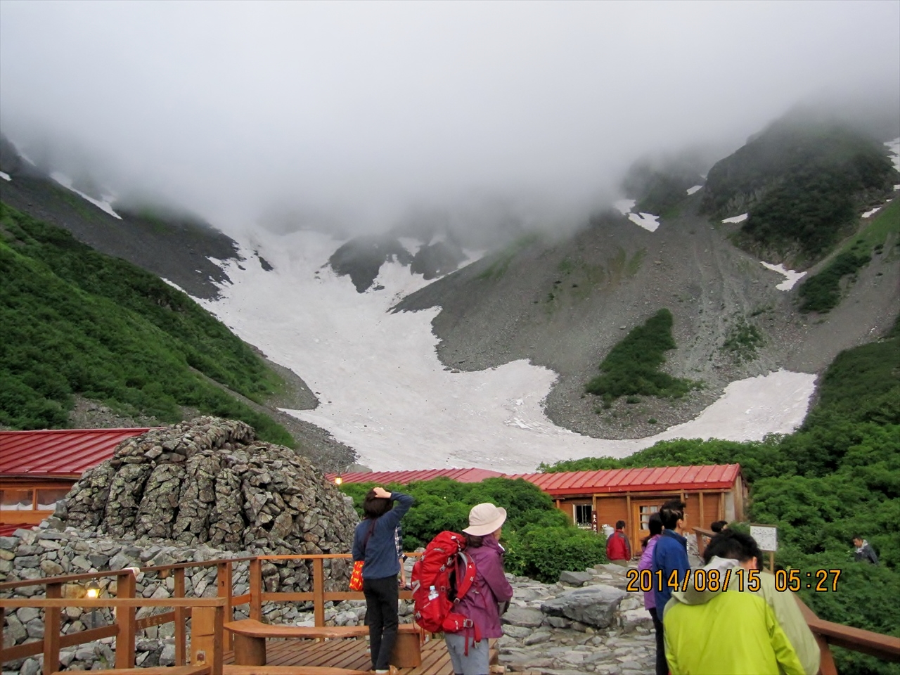 雪渓 | 7時過ぎに出発・・・の前の集合写真 |