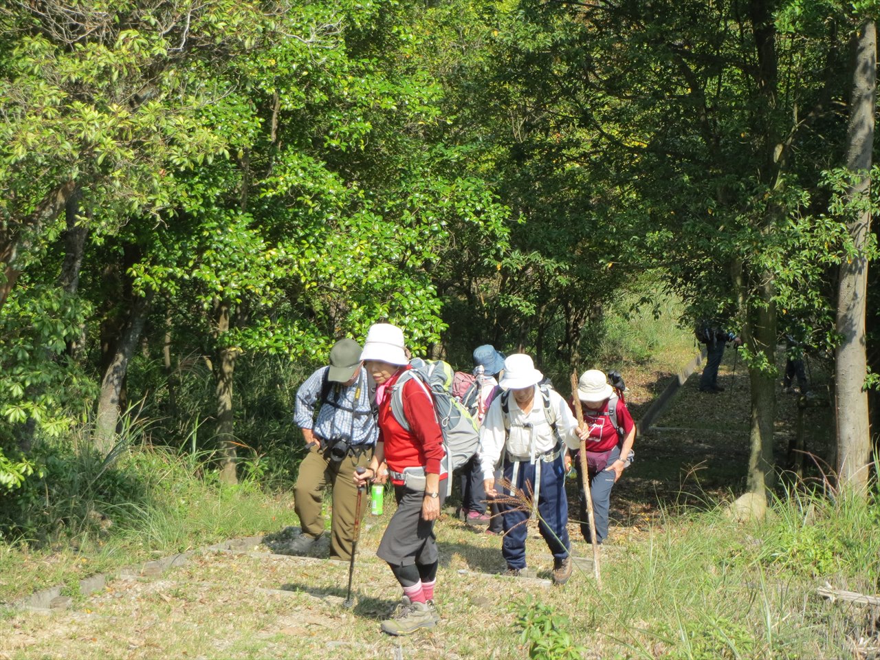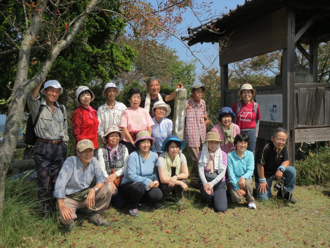 | ランチタイムでは話に花が咲き・・・ | 集合写真でハイポーズ | 下山します |