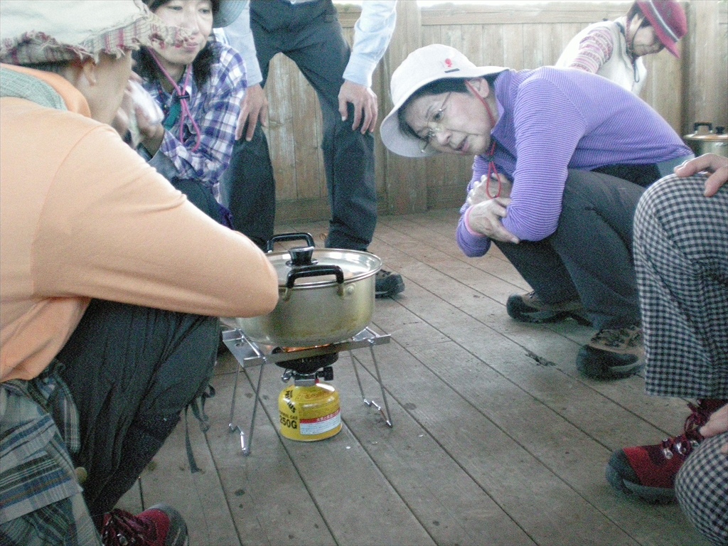 | 休憩小屋から見る深入山山頂です | 休憩小屋でトン汁作り。火加減は大丈夫? | 美味しいトン汁で昼食中 |