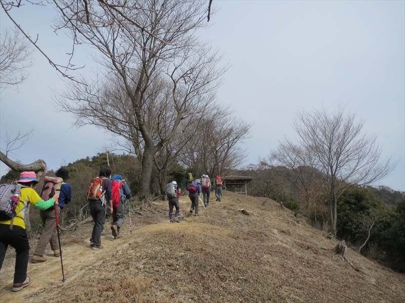 海田駅から岩滝神社まで行き、そこで準備体操をしていつもの歩きより少し早いグループ18名で出発する。何回かの急登をくりかえし揚倉山から呉娑々宇山へと皆さん元気にあるかれました。昼食は寒かったので早々に下山することにする。バクチ岩で昼食をされた後の方達と出会いハイタッチをして下り見晴しの良いところでぐるっと歩いた登山道や尾根また瀬戸内海を眺めながら皆さん元気に下山されました。