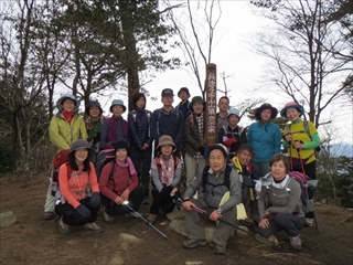 頂上で登頂の証拠写真ともいえる、記念写真を宮木さんに撮ってもらい、次の山高尾山 へと足を進めました。高尾山から岩屋観音に向かう岩を下りる所では、少々苦戦し、 やっぱり岩は登る方がいいねと言いながらその場を後にしました。