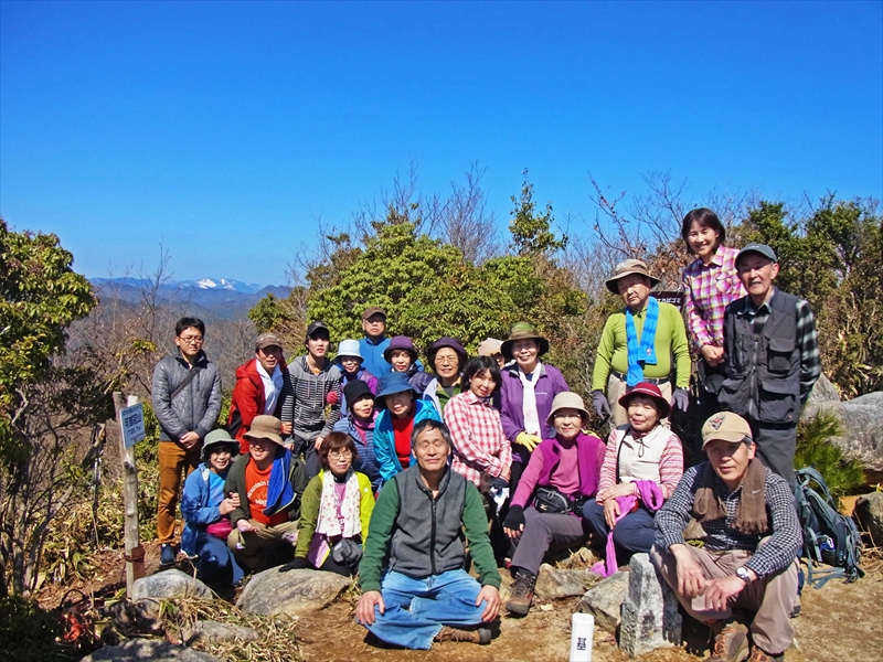 晴れ渡る青空が絵の具で塗ったようにくっきりと青く、周囲の山々の緑もとても綺麗に見え、自然からの贈り物を受け取る事が出来た事で、登頂の喜びもひとしおでした。 下りは登りの風景とはうってかわり、周りの景色を見渡す事が出来ない木々に覆われた道を歩いて行きました。同じような道が続くので歩く時間もとても長く感じました。登山口まで下り、岩を中心に集まった時、賑やかさに驚いたのか日なたぼっこしていた?ヘビが岩の下の方から出てきてびっくり。春を感じた瞬間でした。