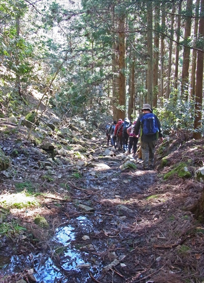 7時43分発の可部行きに間に合うよう身支度をすませ広島駅へ。現地迄車で行かれる方11名、可部線を利用し予約したタクシーに乗られる方13名の計24名の山行。タクシー3台に分乗するのに、1名の方は宮木さんの車が可部駅迄迎えにきてくれていました。竜頭が原園地にタクシー組が到着して全員が揃い、先ず体操をすませ加賀津の滝へ、そこで自己紹介をした後、滝の側の石段を登って行きました。道が時折細くなったりする山道を気をつけながら歩き、小さな沢へ そこを渡ると、次は少しの距離の岩登り。足元に気をつけながら3点確保を意識し登り、急登へと道は続いて行きました。登りきると歩きやすい道へ、沢のせせらぎの音を聞きながら、尾根道を歩いて行き暫く歩くと、舗装された道路へ出ました。