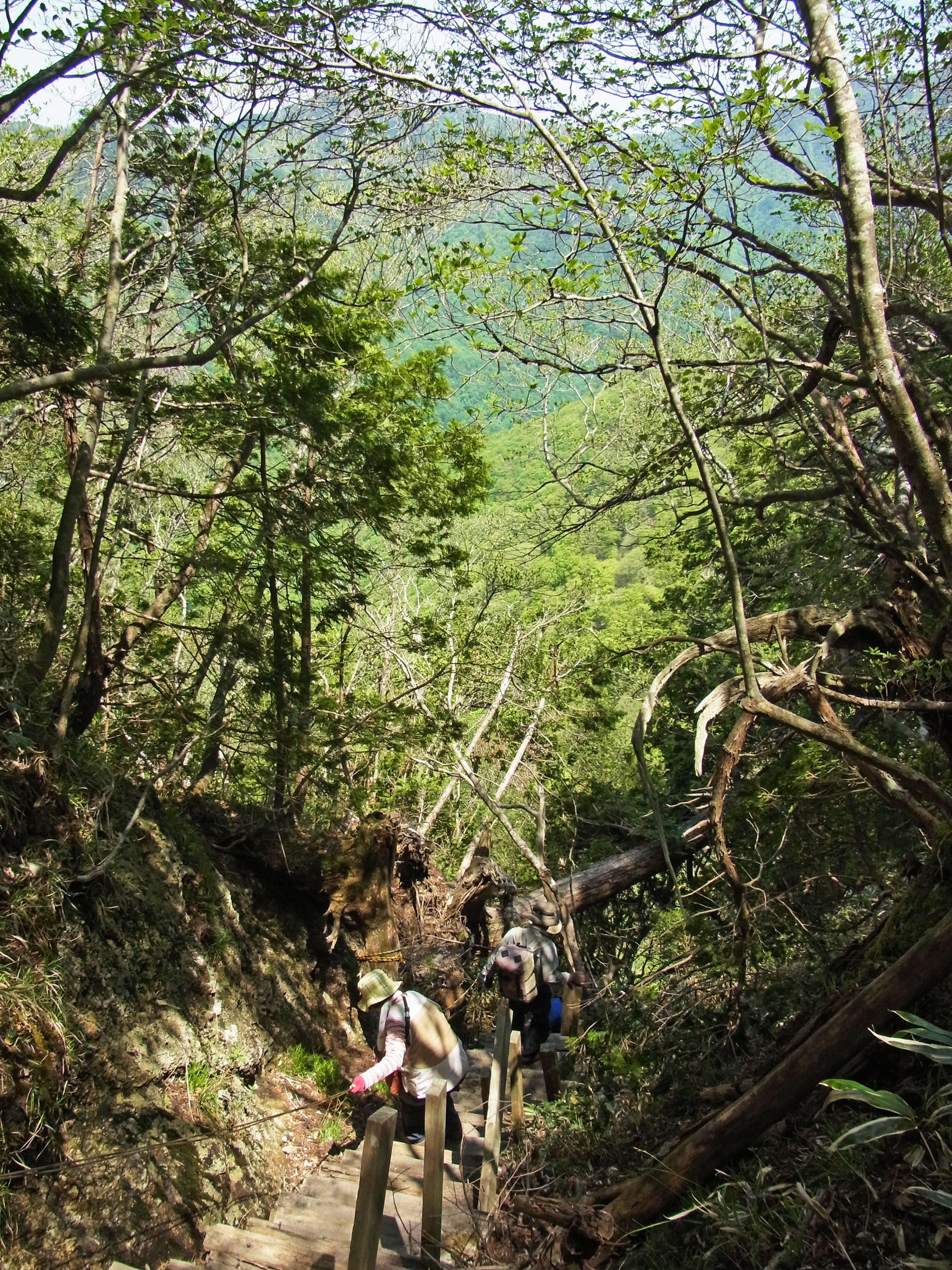 下りは階段でもロープにつかまって