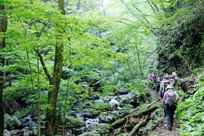 新緑につつまれて沢に沿って歩きます