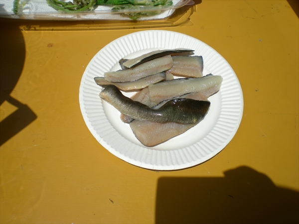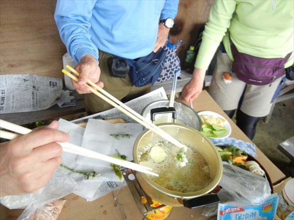 | 揚げたての天ぷらは美味しい! | 差し入れの魚もありました | おなか一杯食べた後は皆で山の歌を合唱 |