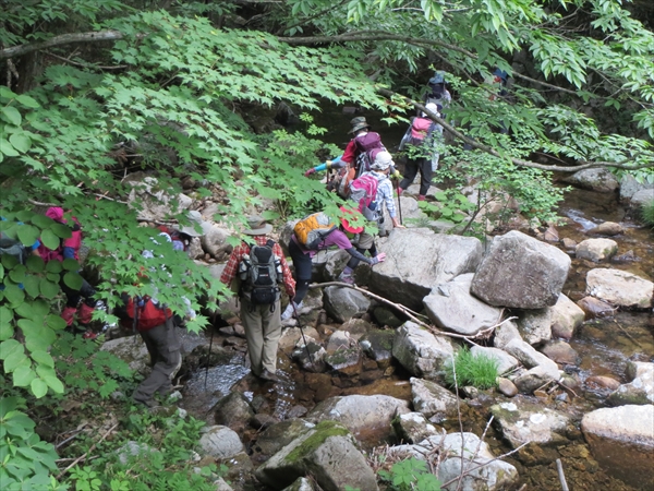 心配していたお天気は暑くもなく、風のある良い天気になりました。来尾峠からいきなりの急な登り坂に体調不良の方もおられましたが、回復され全員揃って無事天狗石山に到着。頂上の展望台の下に咲く可憐な一輪のオオヤマレンゲを交代に観察しました。そこよりはブナ?ミズナラ?の新緑の美しい山道を散歩しているように三ツ石山からスキー場に到着。広々としたところで昼ご飯を美味しく食べました。阿佐山、二丁峠からの下山道にはつぼみのコアジサイがたくさん見られ、これから美しく咲く光景を想像しながら下山しました。最後に一番の難関、沢を無事クリアし怪我なく、気持ちよく山行出来たことを感謝して帰りました。