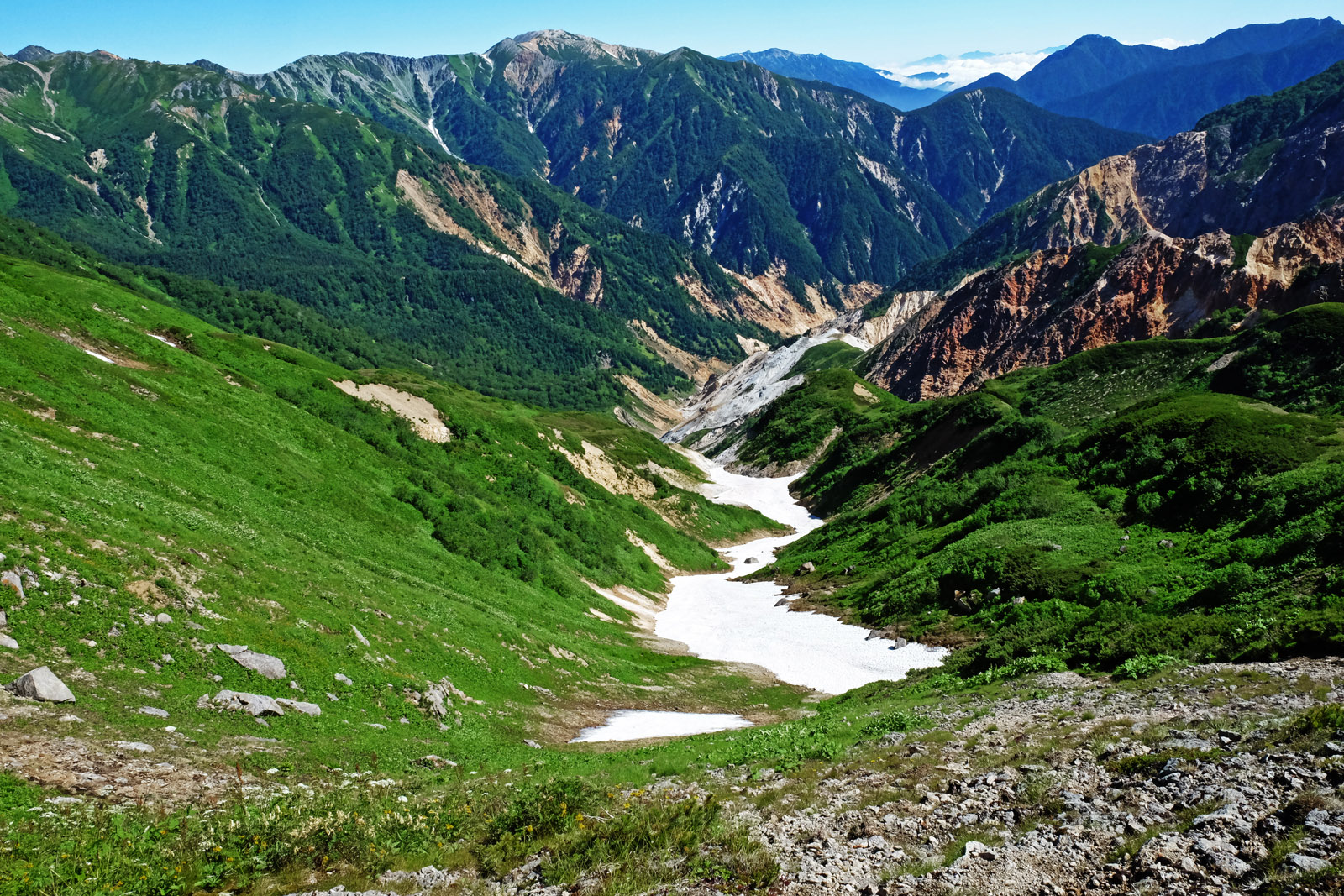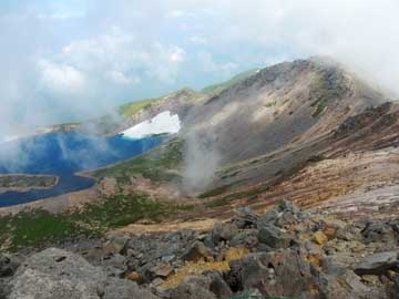 | 樅沢岳から槍へ。北鎌尾根を見る | 何を見つけたのか? | 北側は硫黄沢で岩肌は赤茶色 遠く雲海に浮かぶは後立山連峰か |