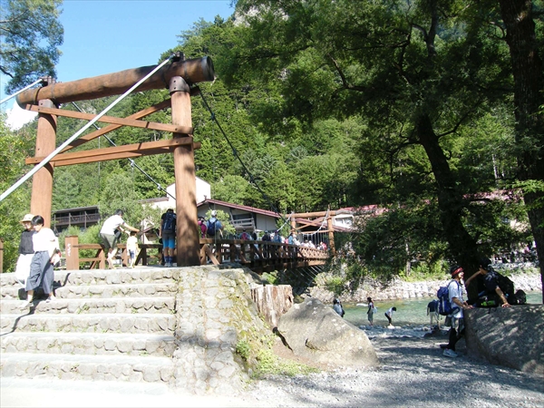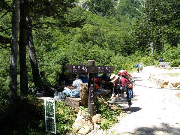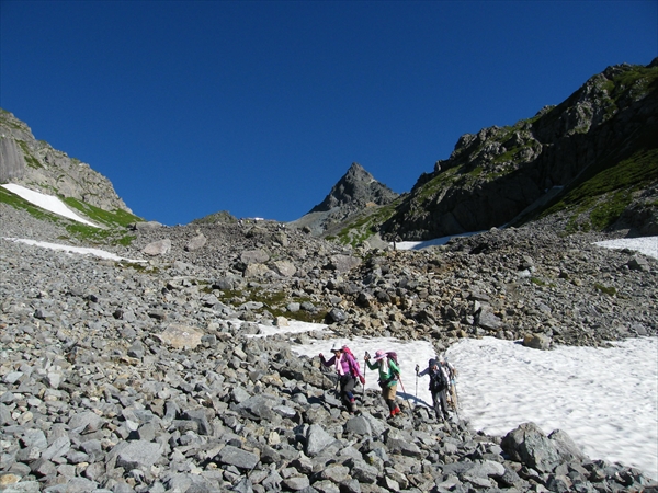 槍をバックに雪渓の残る槍沢を下る | 長い長い槍沢を下ってやっと槍沢ロッジへ |