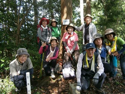最近の山行としては、参加者が少なく10人であった。9時10分に大原駅近くの駐車場を出発、間野平発電所に同乗者を下し4台で宇賀峡に向かう。しかし、所定の駐車場を通り過ぎ30分近くロス。3台を空き地に駐車して間野平発電所に帰る。1時間近く待たされた参加者からブーイング。気を取り直してストレッチを行い、登りにつく。最初から急登が続き「下見の時よりきつい」という人あり、適宜休憩を取りながら頂上をめざす。頂上下の超急登を励ましながら登り想定時間内に久地冠山山頂に着く。