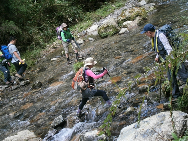 2、3日前の雨の影響か、飛び石が水の中、上流の方に捜しに行くが渡れる場所はなく、やむなく安全な場所を確保しながら渡る。無事、事故なく山行が終了した。Kさん、「広島近郊の山としては、意外と厳しい山でしたね」。平日山行としてはハードな山であった。また、CLとしては反省点が多々あった山行でもあった。(記 三村正弘)