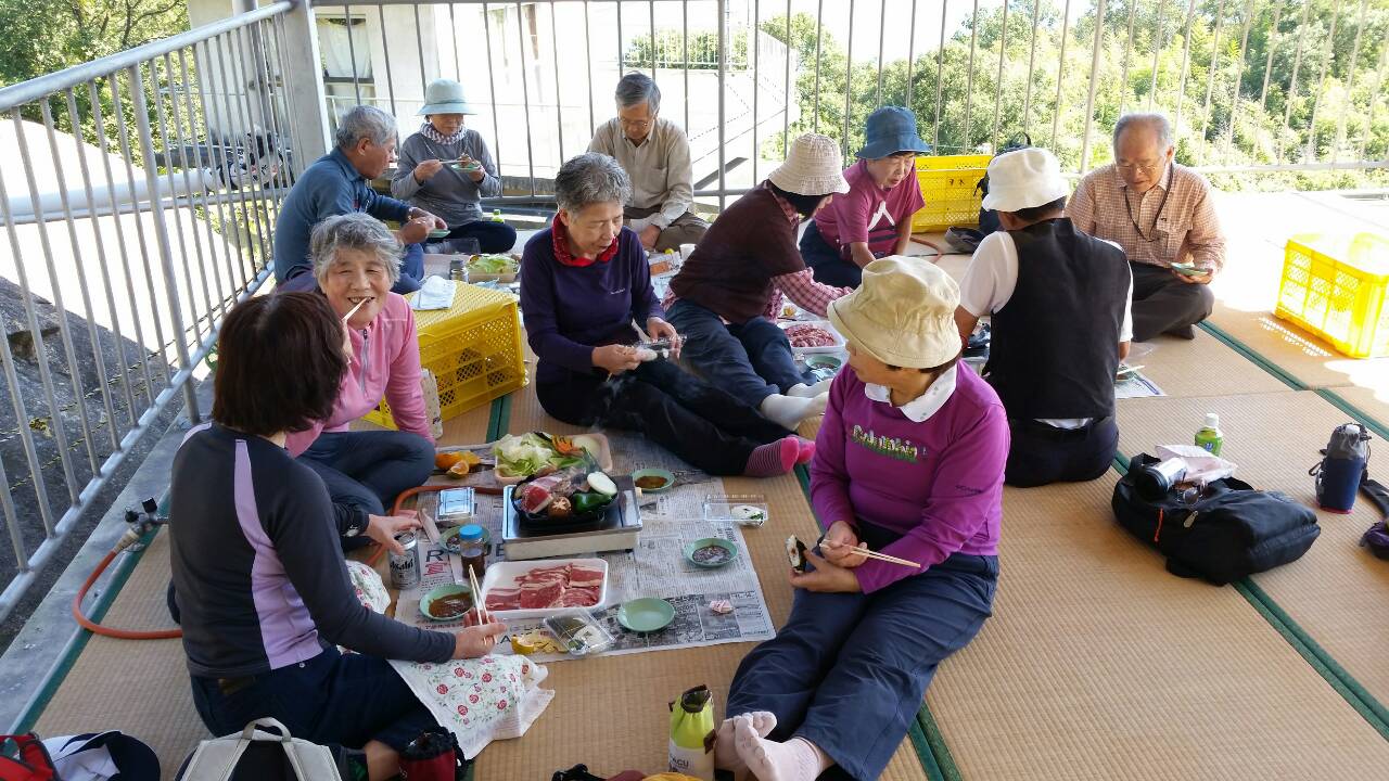 食事は屋根付の50畳位の座敷を貸切、景観は絵下山・灰ケ峰・瀬戸内が見える高台で牛のジンギスカン料理を堪能、むすび2個は食べきれずお持ち帰りの人もあり、又各自の差し入れもあり微笑みながら雑団に花を咲かせました。