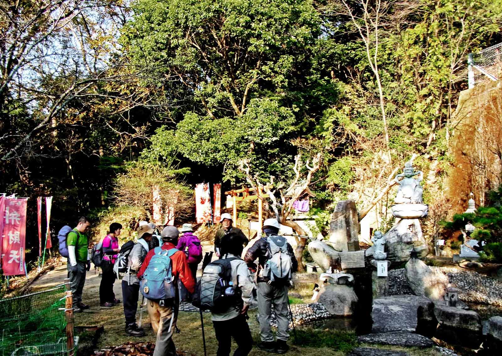 数日前からの予報では50%の降雨とあった。心配していた雨も当日は快晴。登山口の蓮華寺からは八十八体の石仏に導かれながら旧蓮華寺跡に到着、石仏と祠を清掃している地元の女性と出会う。「ご苦労さまです」。更に高度を上げ前原山「通称蓮華寺山」の中心広場で休憩、春は桜の名所でもある。再び嶺線を進むと、えっ! 突如人一人が入れる広さの温泉場が現れる、猪の沼田場である。もう一ヶ所は水が張ってあり手製の看板には『猪鹿温泉混浴の湯』と記してあった。春に蝶々が訪れれば猪鹿蝶(わかるかな?)更に4ヶ所のピークを越え鞍部より最後の急坂を喘ぎながら「CL」、高城山の頂上に到着。山頂は小春日和というより初夏を思わせる暖かさである。昼食と休憩を充分に取りノンビリ、ノビノビ、リフレッシュ後下山開始途中分岐からスカイレールみどり坂頂上駅へと向かう。ゴンドラからは東に水が丸山、正面に安芸アルプス連山、南に瀬戸内海、振り返れば蓮華寺山の嶺線と高城山等の眺望は絶景であった。