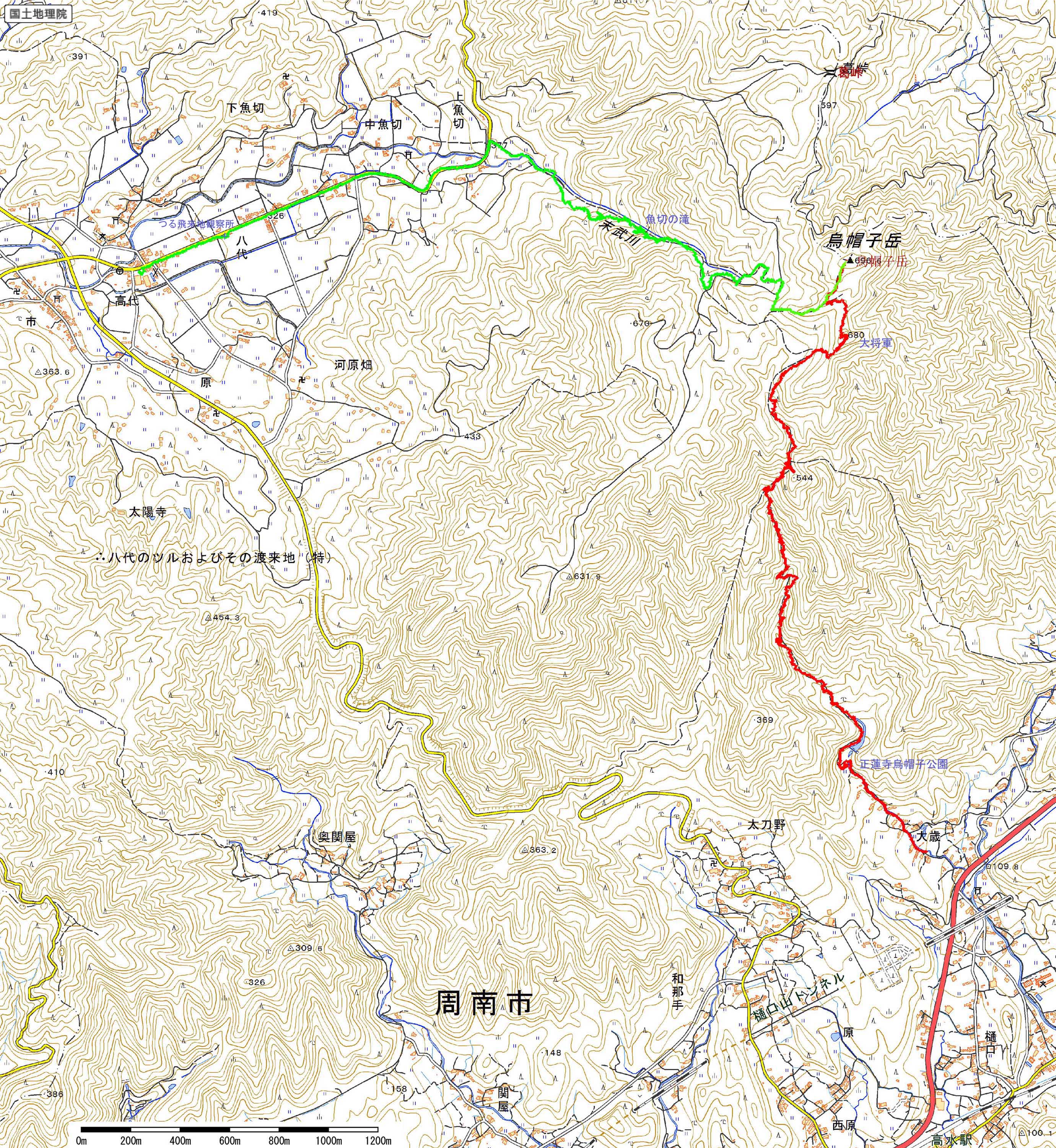 歩いたコース:上り赤色,下り緑色