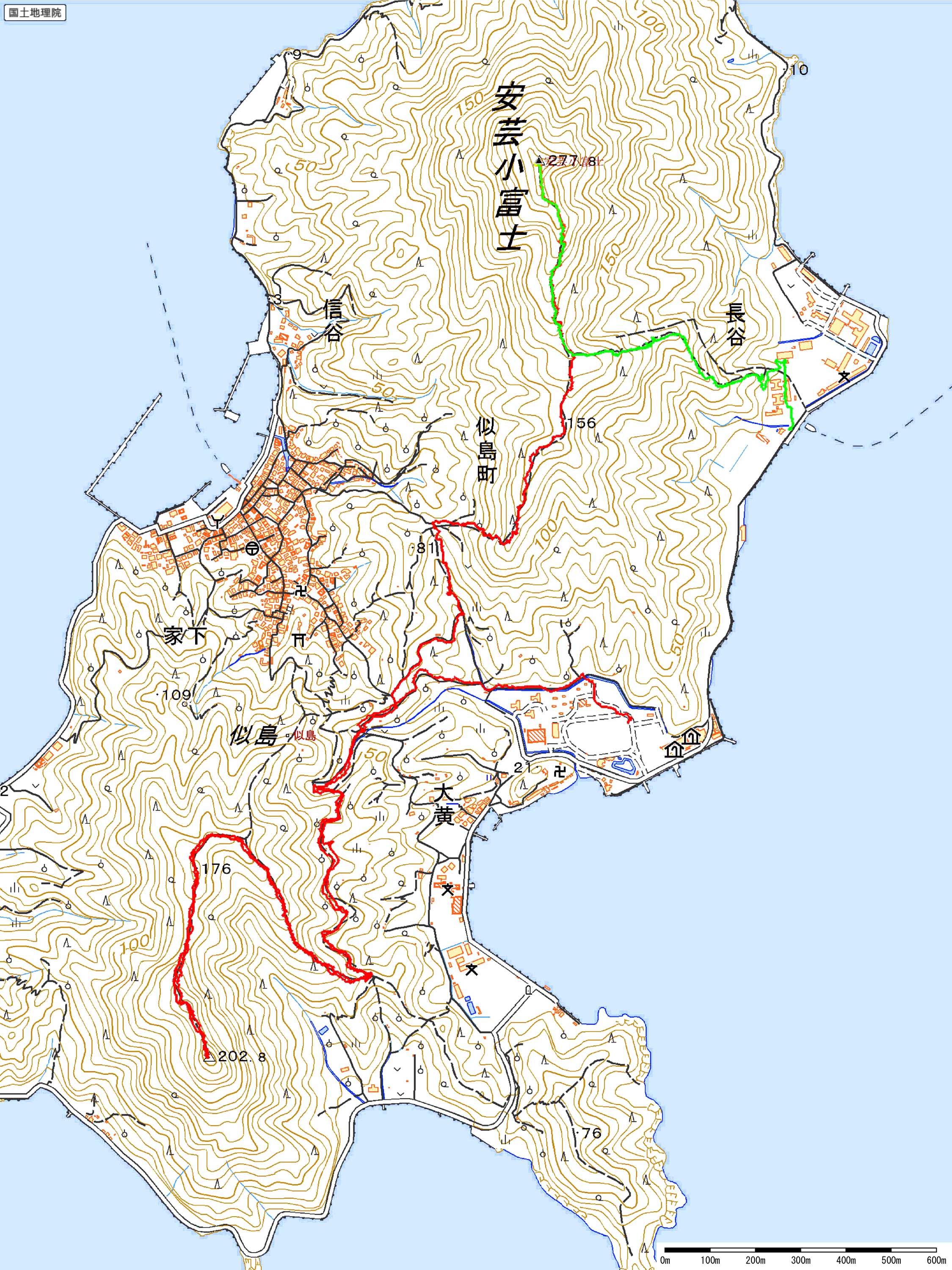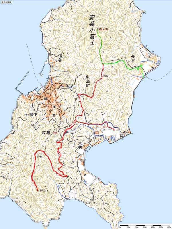 歩いたコース:緑色(登り),赤色(下り)