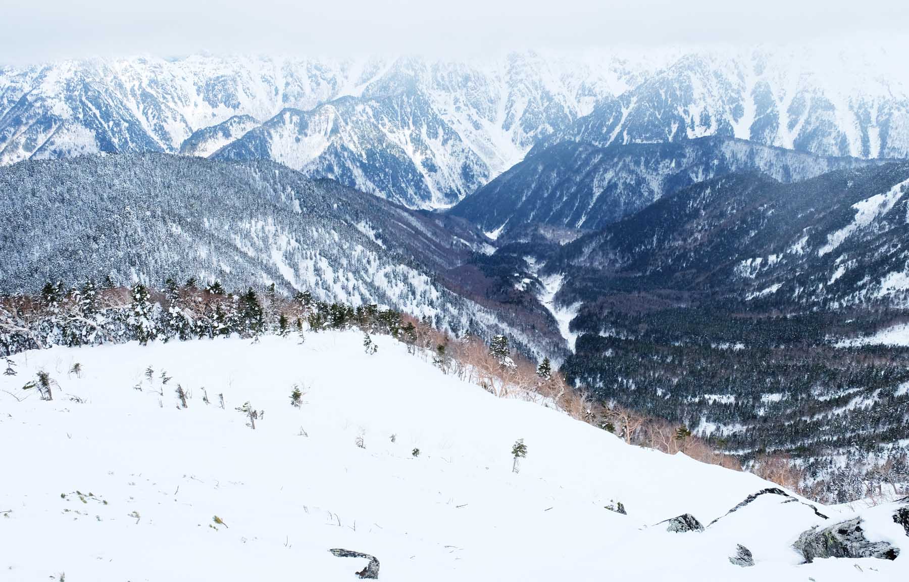 | ロープウェイ終点駅から見る笠ガ岳方面 | 途中よりの西穂高連峰 | 西穂山荘への道 |