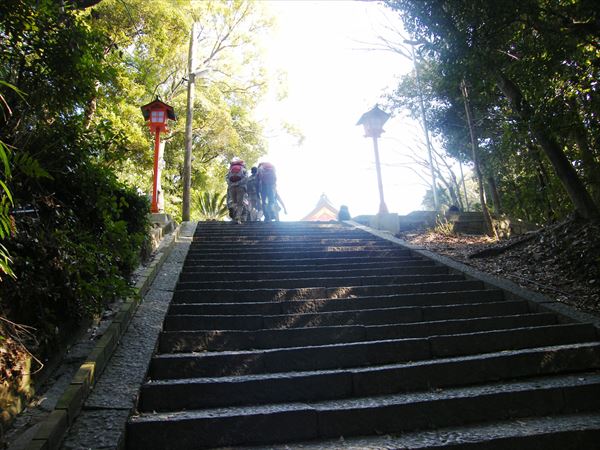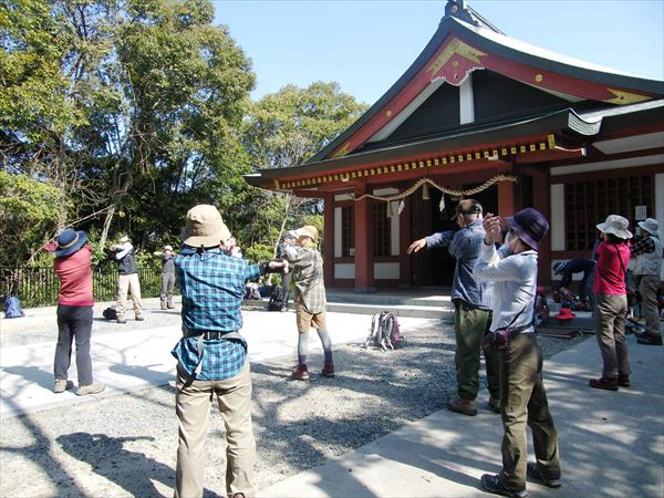 | でだしから長い階段を登る | 境内で準備体操 | けっこうつらい登り道 |