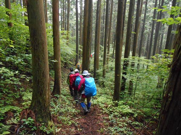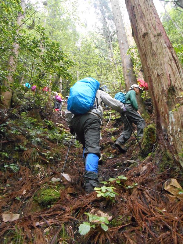| 水量が心配された最初の渡渉 | 急登が続く | 堰堤側で見かけたモリアオガエルのたまご |