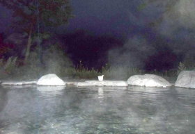 白水湖に臨む露天風呂は夜に |