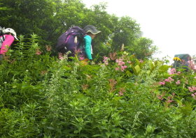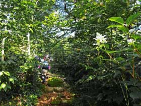 花の道を登る |