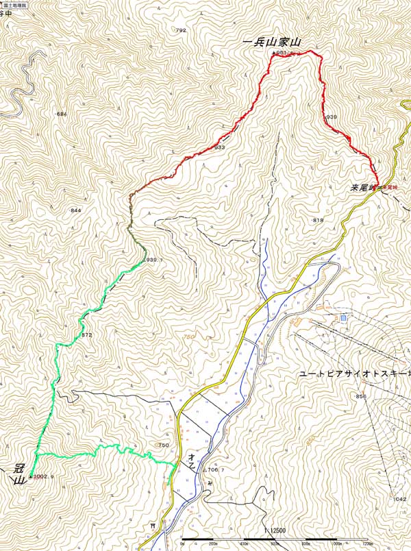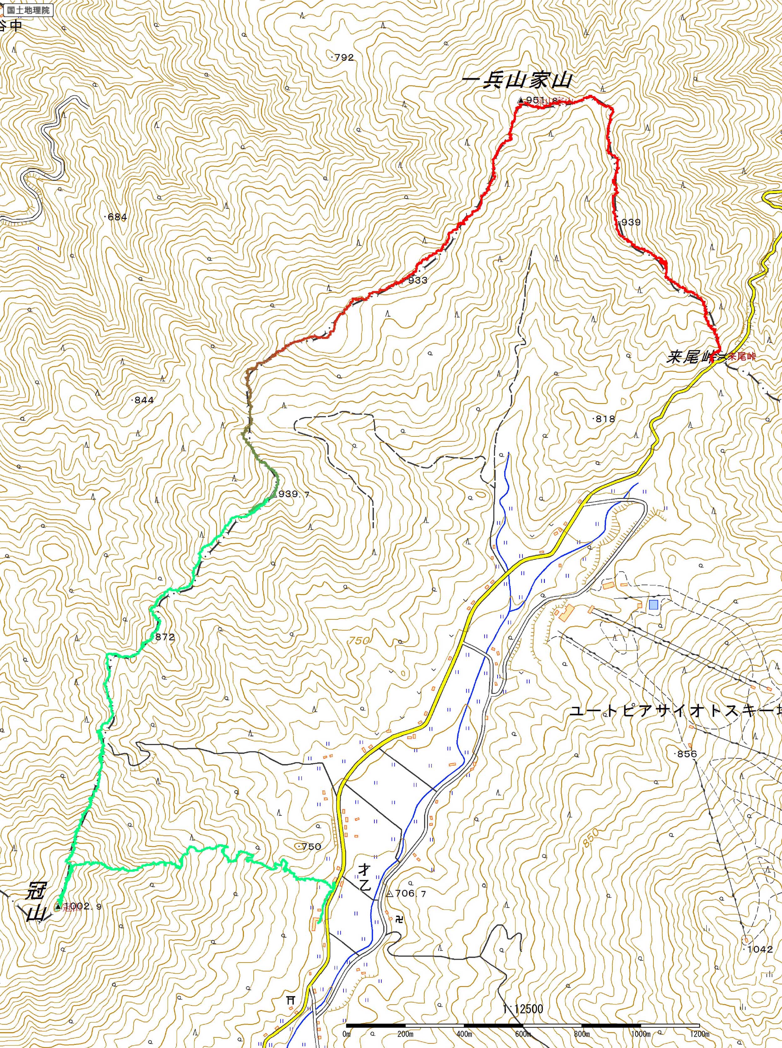 歩いたコース:赤色(登り),緑色(下り)