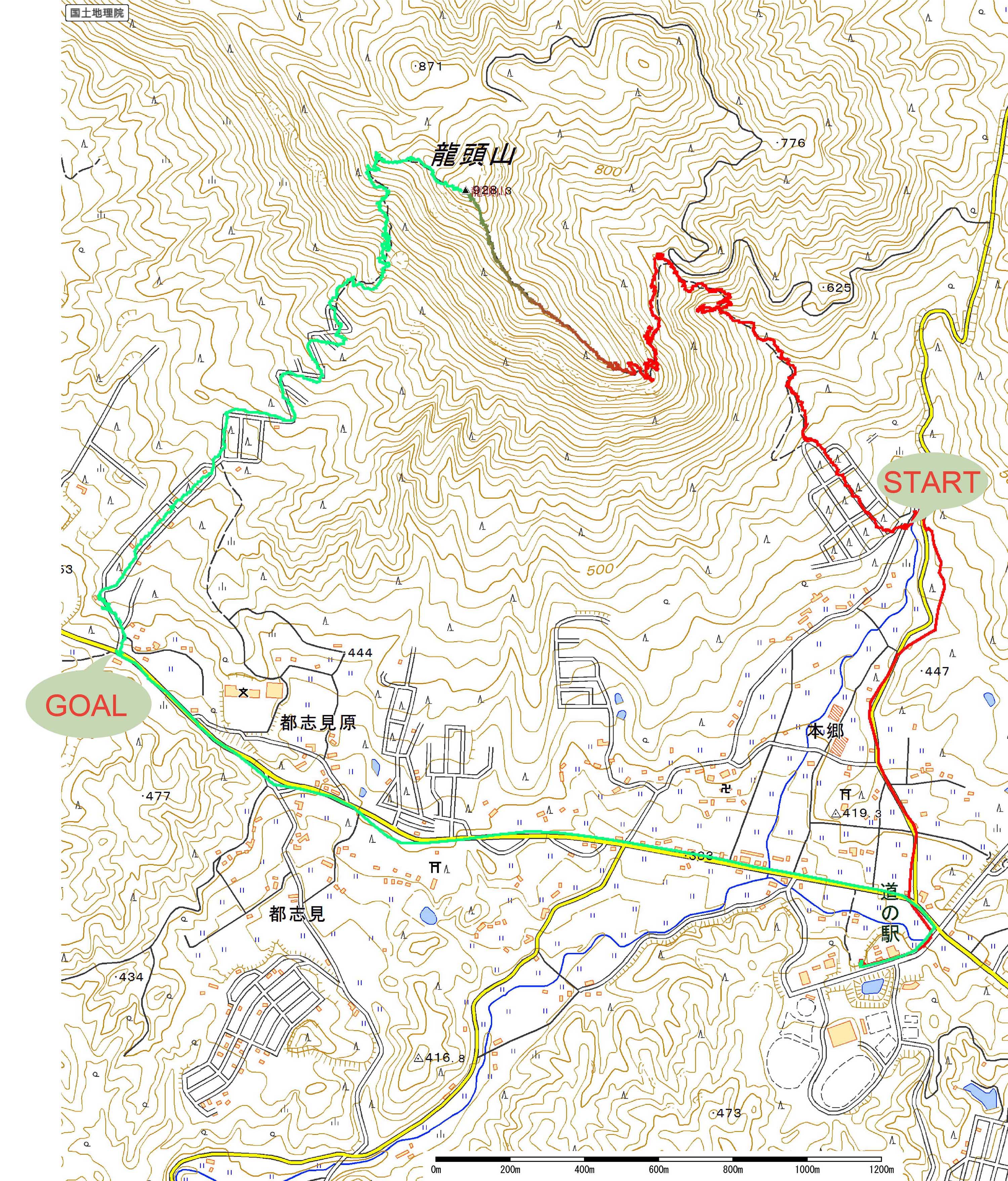 歩いたコース:赤色(登り),緑色(下り)