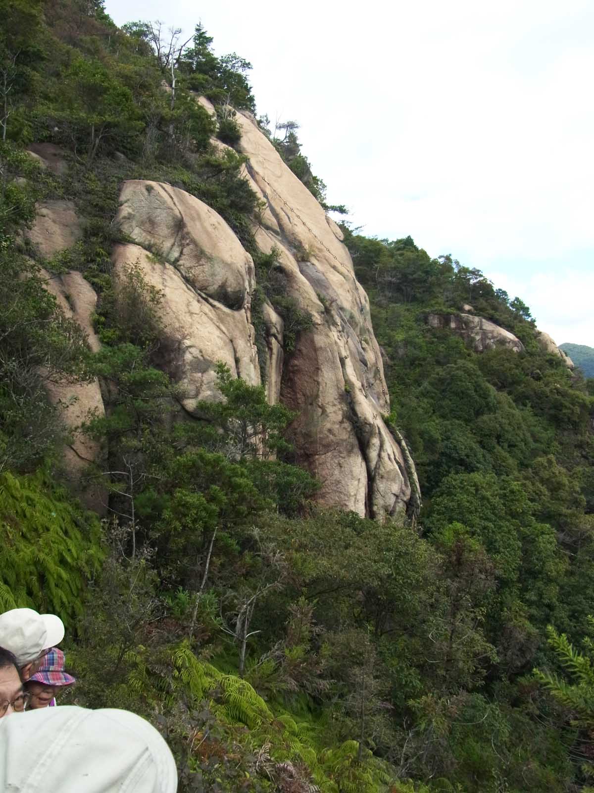 石鎚神社で体操と新会員、会友さんが居たので自己紹介後神社の右手から登山開始。 行場の、天狗の力水、修行する人以外は登ってはいけない3つの鎖場。若木さんが木や草花の説明をして下さり、結構足を上げる急な岩場、どこに立っても最高の見晴らし、天気で良かったねと言いながら、10時45分に山頂到着。