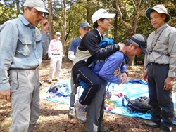 やまぼうしで、8月28日に行われた、ロープワーク講習会のより実践的な、ハイキングレスキュー訓練に参加してきました。まず、雨具とストックを使っての搬送、雨具のみで救護者を背負って搬送、カラのリックを使っての救護者の搬送、雪上搬送法(テントのフライシート、+カラビナ+スリングなどを使用)を実施、体験しました。山行中に、救護者が出た場合、救護者に、どこがいたいのか?寒いのか?の問いかけることや、ヘリを呼ぶ際、スマホや、カメラ(GPS機能付)で、緯度、経度を知らせたら、的確にヘリが来る。ことなど知りました。昼食後は、6oロープを使って、ロープの結び方、スリングを使用して、簡易ハーネスの作り方、安全確保の仕方などを学びました。やまぼうし会員以外の方は、、普段の山行においても、ロープやカラビナを使用しておられるみたいで、動きが、スムーズでした。
