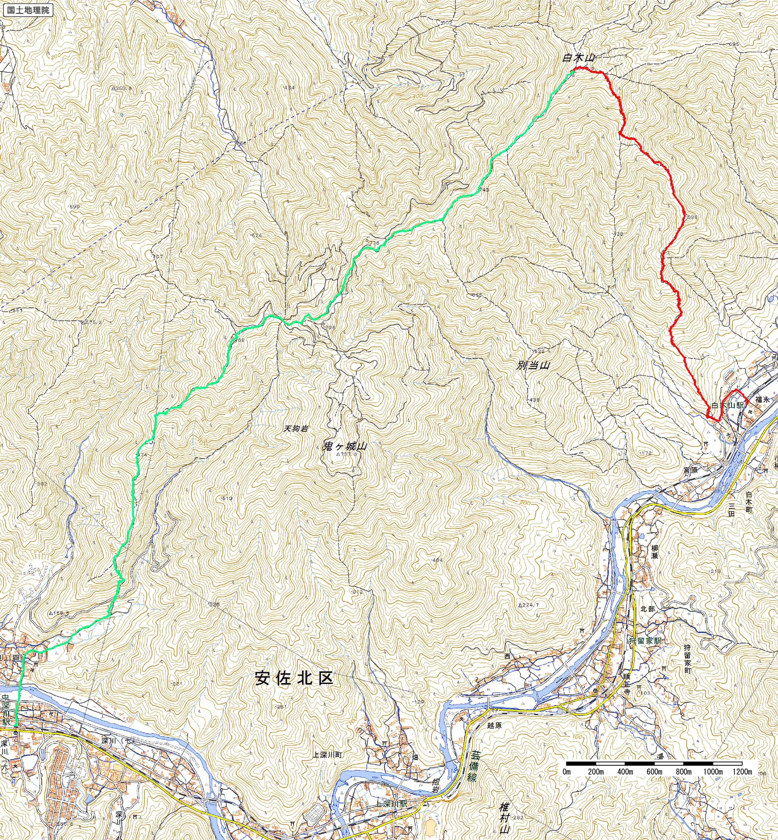歩いたコース:赤色(登り),緑色(下り)