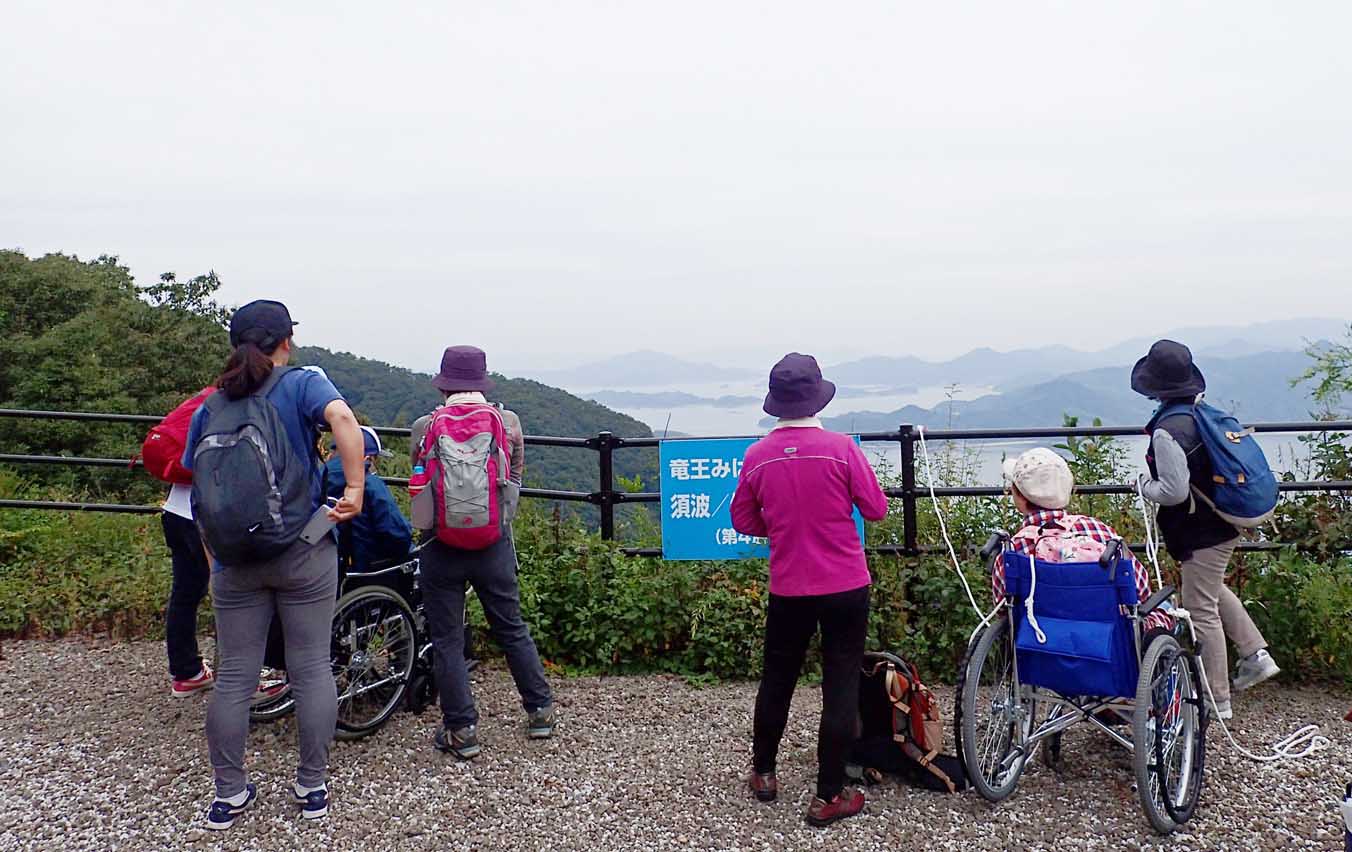 このたびは、車椅子グループ、登山グループとも距離を変え同じ道を歩きました。瀬戸内海から吹いてくる気持ち良い風を感じながら道路を歩きました。総勢60人、障がい者の人はヘルパーさんと、やまぼうしの皆さん支援を受けながら無事登頂しました。少し予定より遅くなりましたが事故もなくみなさん元気でした。早速弁当、やまぼうしの人達が作った豚汁を美味しく頂きました。陽射しも余り強く無く、絶好の登山日和でした。