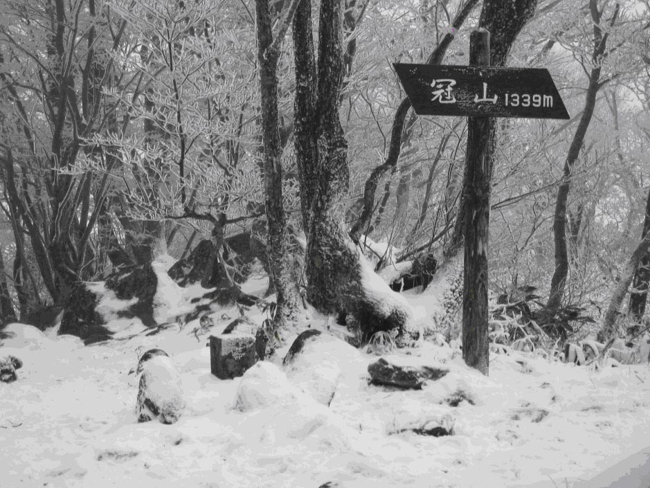 「冠山へ30分」と書かれた小さな看板を見つけ、右手の道に入る。標高で約1200mに近い高さがあるこのあたりから積雪が多くなった。雪の重みで笹の葉が頭を下げ登山道を覆っている。最後の登りを超えると一等三角点と「冠山1339m」と書かれた標識があり山頂到着である。雪交じりの北風に吹かれると体温が奪われそうだが写真撮影を行う。風を避け下山道に下がったところで昼食を少し食べ、体が冷えないうちに慌ただしく下山することにする。下り道は思ったほど滑らず、ある程度下がると雪も少なくなり、風も穏やかとなった。やがて工事中の林道に出て、これを横断して沢に沿った杉木立の道を行く、ところどころ倒木が道をふさいでいる。鉄製の橋を渡ると自動車道にでる。タイヤ工場の前で待つマイクロバスに乗って汐原温泉に行き汗を流した。