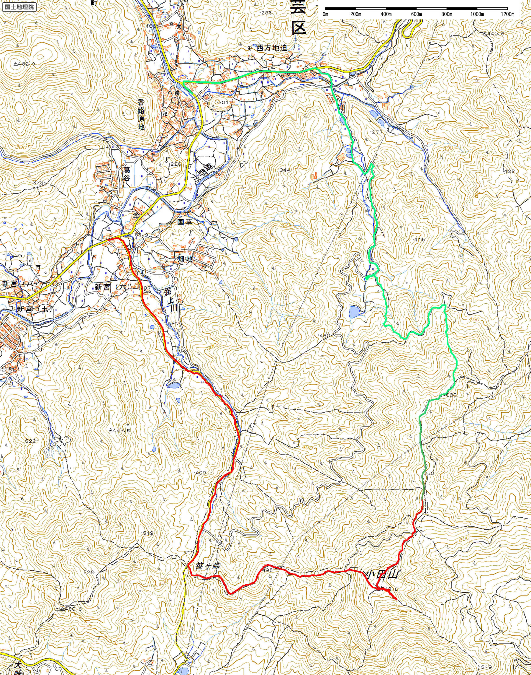 歩いたコース:赤色(登り),緑色(下り)