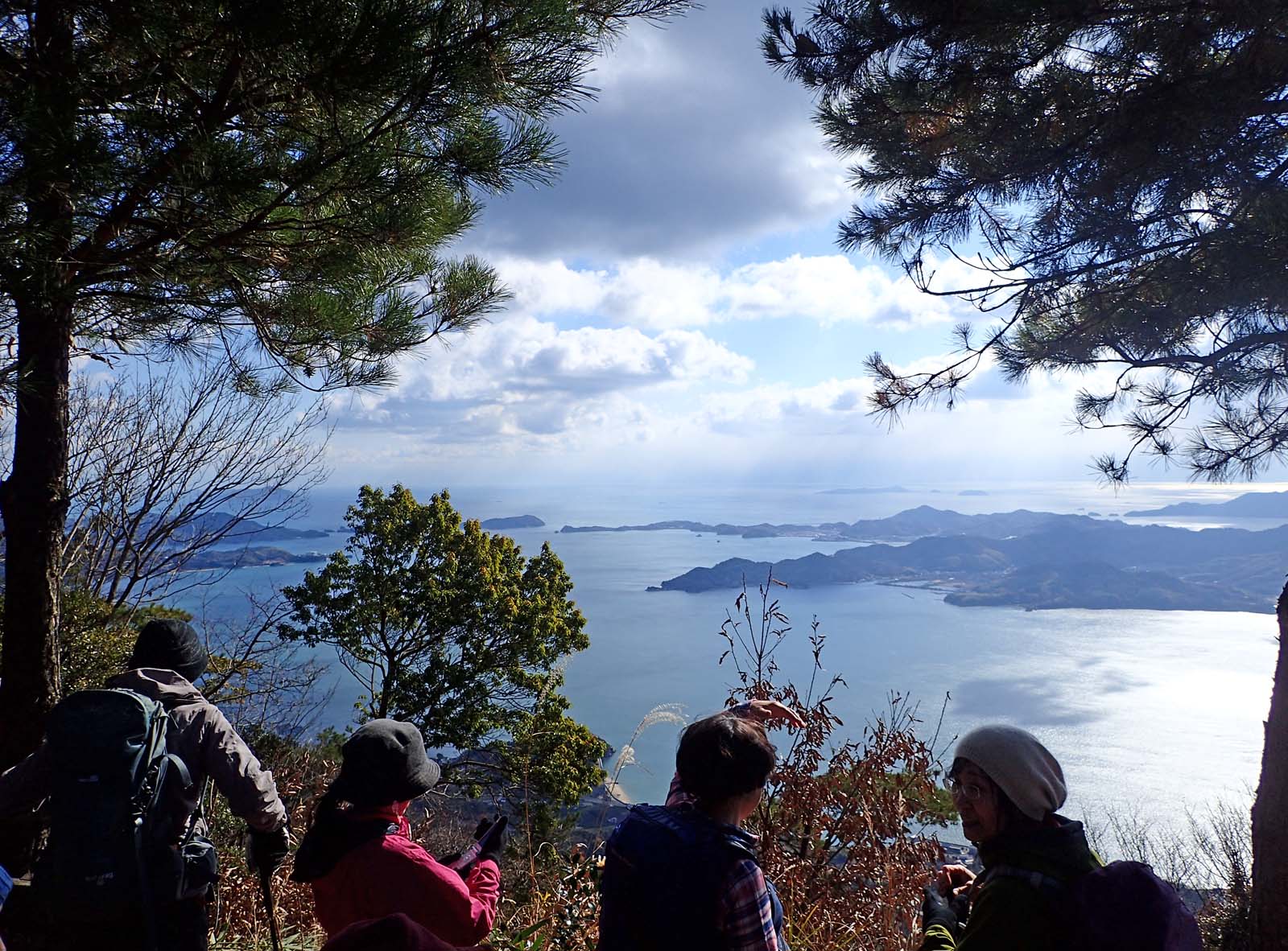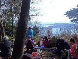垂水登山口から瀬戸内海の風景を堪能しながら地元の人に親しまれている鐘撞堂に1時間で到着。全員が鐘をたたくと地域の迷惑になるので代表4名が打つ。いい音。心が洗われる。山頂までは1分。島・海の多島美を心ゆくまで眺め、「いつまでも眺めていたい」という言葉を後ろに昼食をとる広いところまで移動。風は冷たくなかったけど、じーっとしているとやはり寒い。三浦さん手製の甘酒をいただき、1時間後に下山開始。伊豆里峠で、昔は作っていただろうと思われるキュウイ畑を通る。今は手入れがされていないので気がつかなければいいがと思ったが、キュウイが鈴なりになっているので気が付かないことはない。少しずついただいて下山する。1時間余りで伊豆里登山口到着。伊豆里峠の分岐で後方の人(4名)が中野ダム方面へ行った。4名はすぐ気がついて連絡が通じ大事に至らず全員で無事下山することができた。