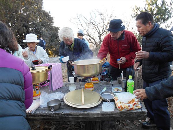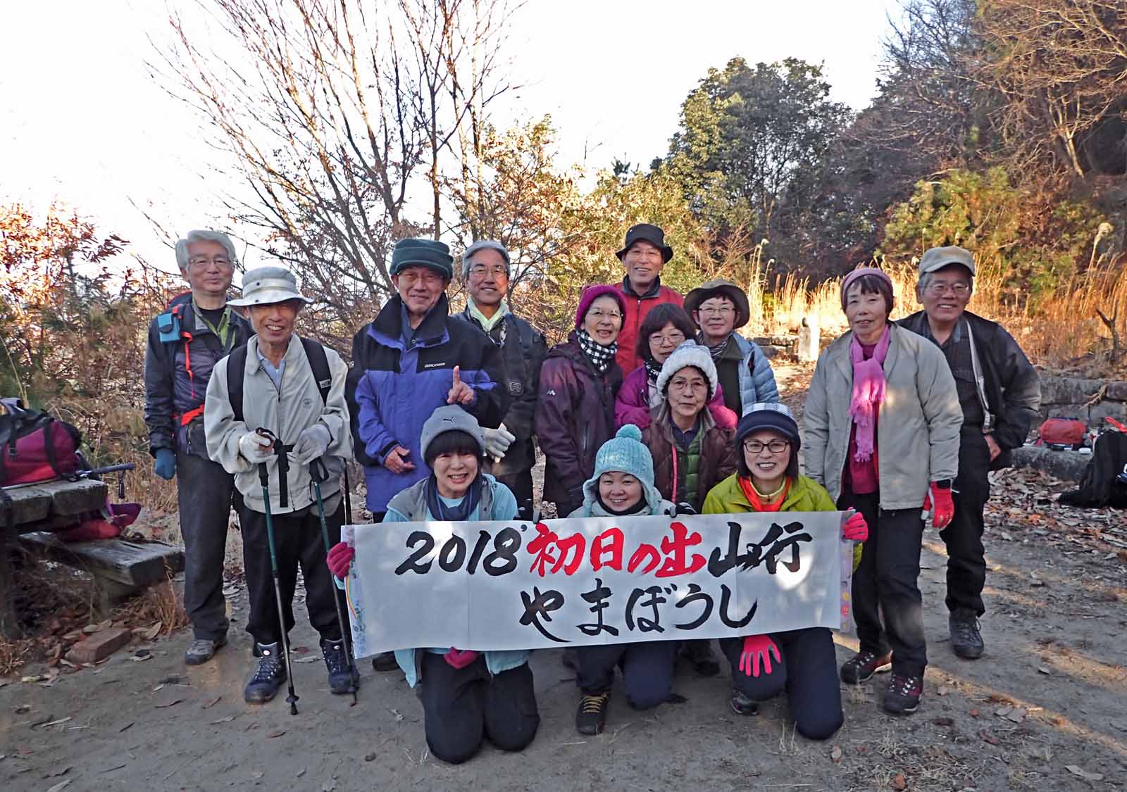 恒例の初日の出山行で高尾山に登りました。例年は岩屋観音で初日の出を迎えるのですが高尾山が府中町最高峰なので二手に分かれ一隊は岩屋観音でもう一隊は高尾山で初日の出を迎えました。風もなく穏やかな元旦でしたがあいにくお日様の昇る方向に大きな雲が立ちはだかり残念ながら日の出を拝むことは出来ませんでした。しかし岩屋観音寺跡地ではお雑煮やお神酒を大いに楽しみました。お雑煮もお酒ももう駄目!というぐらい・・・満腹!満腹!持ち寄りの料理やお菓子もたくさんいただきました。越智さんや福田さんの新入会員さんも参加されあれやこれやと話もとてもはずみました。(記 宮木一民)