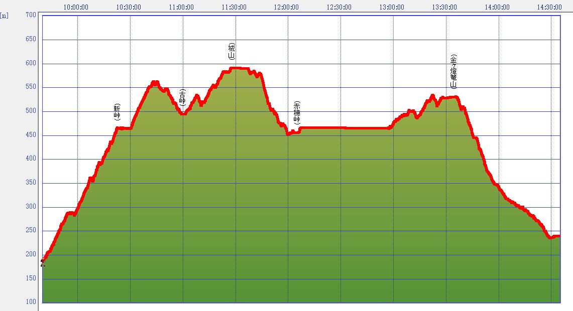 コースタイム - JR海田駅集合9:00〜(9:30)ふれあいバス乗車〜運動公園 トイレ体操後出発(9:35)〜新峠(10:20)〜(10:55)古峠(11:05) 〜(11:20)城山(11:40)〜(12:05)昼食赤穂峠(13:00)〜 (13:25)金ヶ灯篭山(13:35)〜障碍者活動センタ−下山口(14:00) 〜広電バス熊野車庫(14:30) 報 告