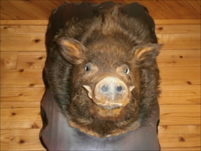 総合公園で迫力あるイノシシのはく製に迎えられ