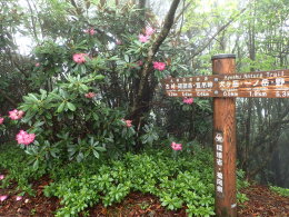 【9日】 天気予報などで今日は絶対晴れると思っていたのにくもり空で雨具をつけるほどではないが時折霧雨が降る。そんな状態が続いた。昨夜は大雨が降り、昨年は気がつかなかった徒渉が2〜3回あった。縦走路では左右に国の天然記念物ツクシシャクナゲのピンクの花がたくさん見受けられた。ブナの新緑に映えてとても美しい。下山は予定を変更して歩行時間は長くなるが滝さんより提案された求菩提山に続く尾根路を降りることにした。下山予定の恐淵コースの徒渉に不安があったからだ。(途中出会った登山者や恐淵コースを登ってきた訓練中の消防隊員の方たちの話を聞いた)とても気持ちのよい尾根路で前日資料館の写真で見たいろいろな洞窟を見ながら下山した。2時間近く長く歩くことになるが全員無事降りることが出来た。一泊二日の山行をみんなで楽しむことが出来たのも諸任務を引き受けてくれた皆さんや変更コースを提案してもらった滝さんのお陰だと感謝します。(記 宮木一民)